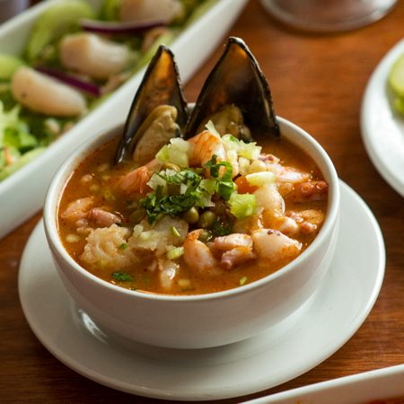 Camarón, jaiba, callo, ostión y pulpo con pico de gallo y aguacate, acompañado de galletas y salsa picante.