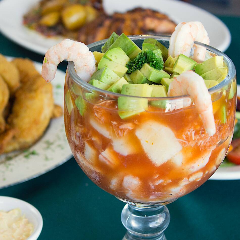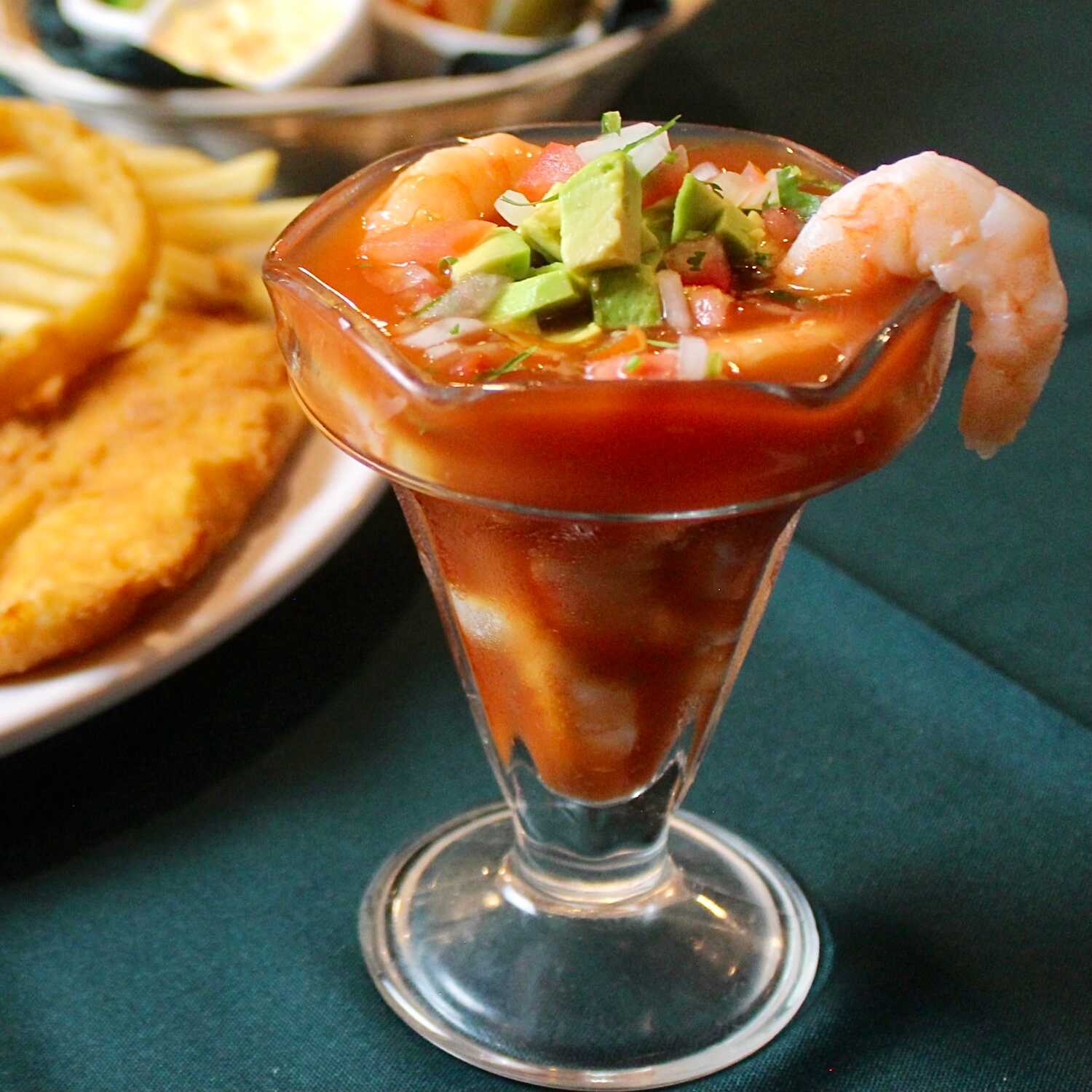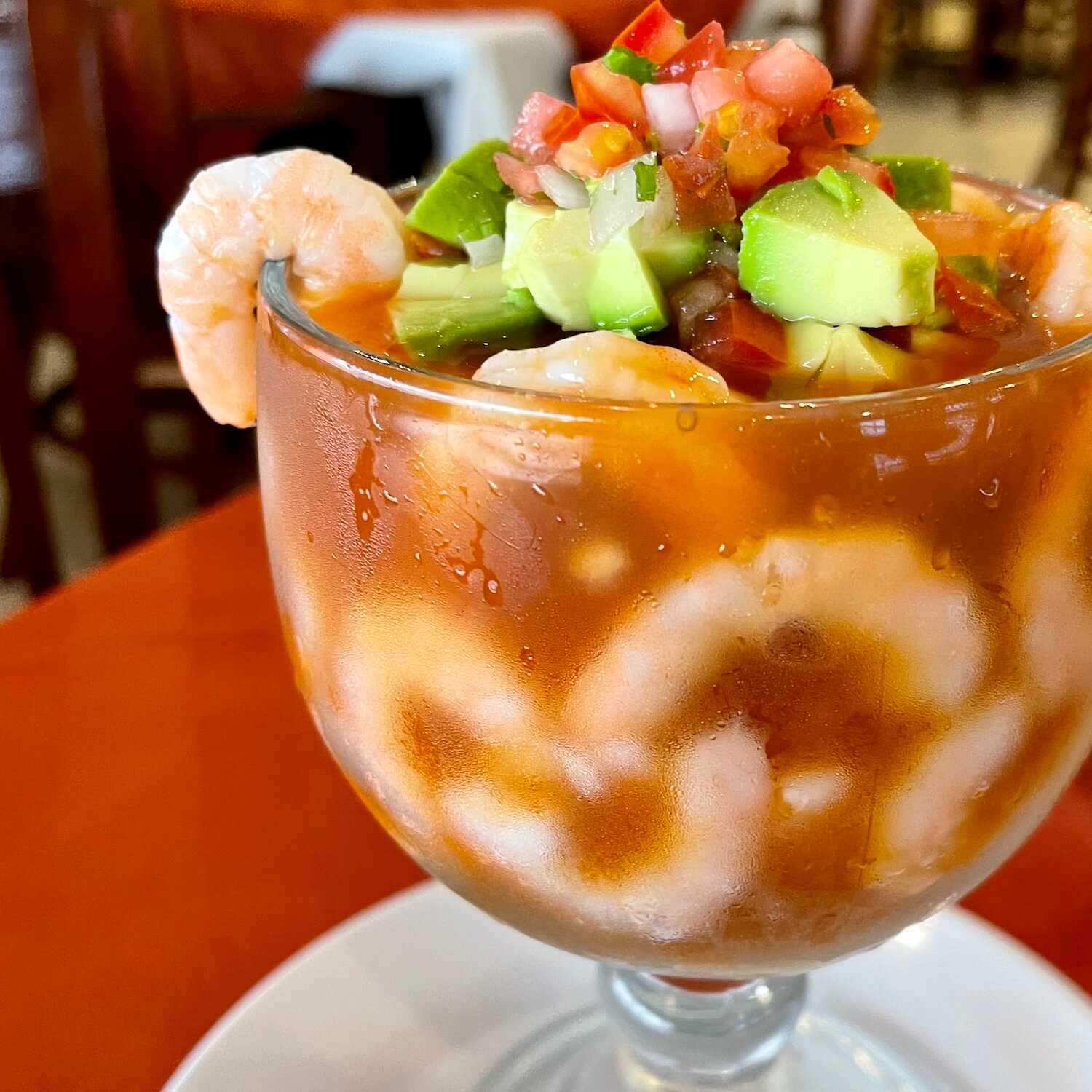 Camarón en fresca salsa coctelera con pico de gallo y aguacate. Acompañado de galletas y salsa picante.