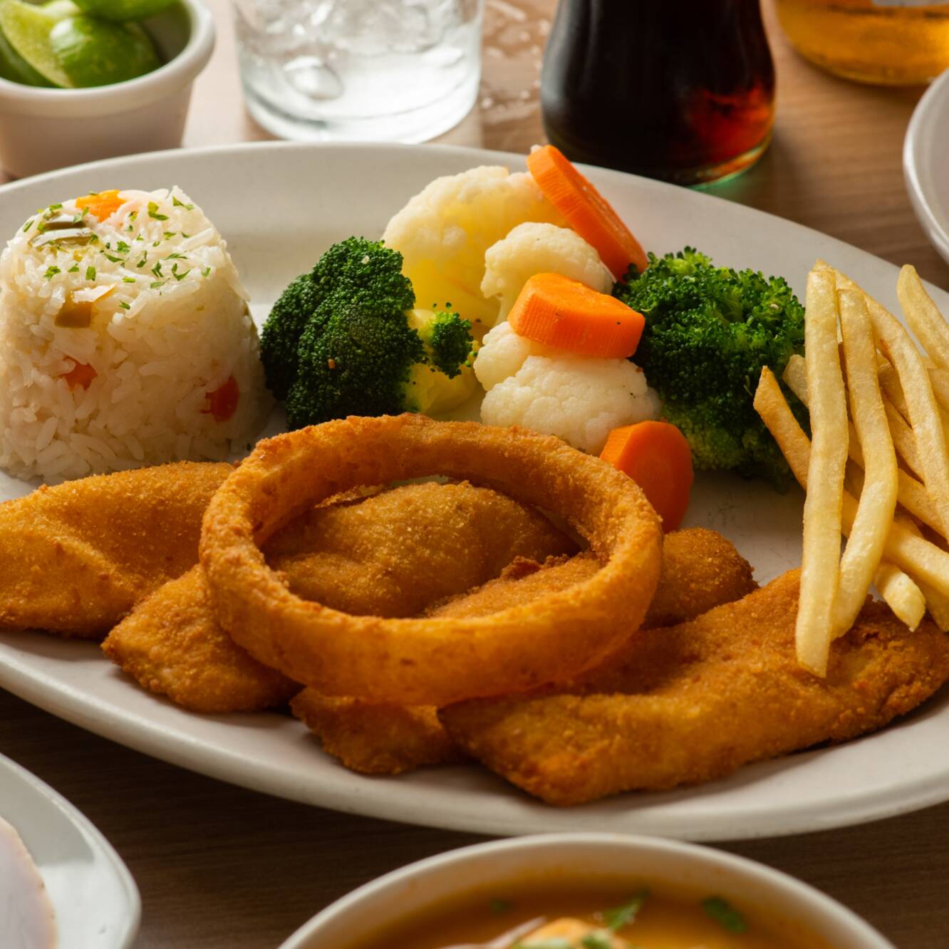 180gr Filete de tilapia al gusto con guarnición tradicional: arroz, verduras, papas a la francesa y un aro de cebolla. Acompañado de salsa tártara, limón y salsa picante.