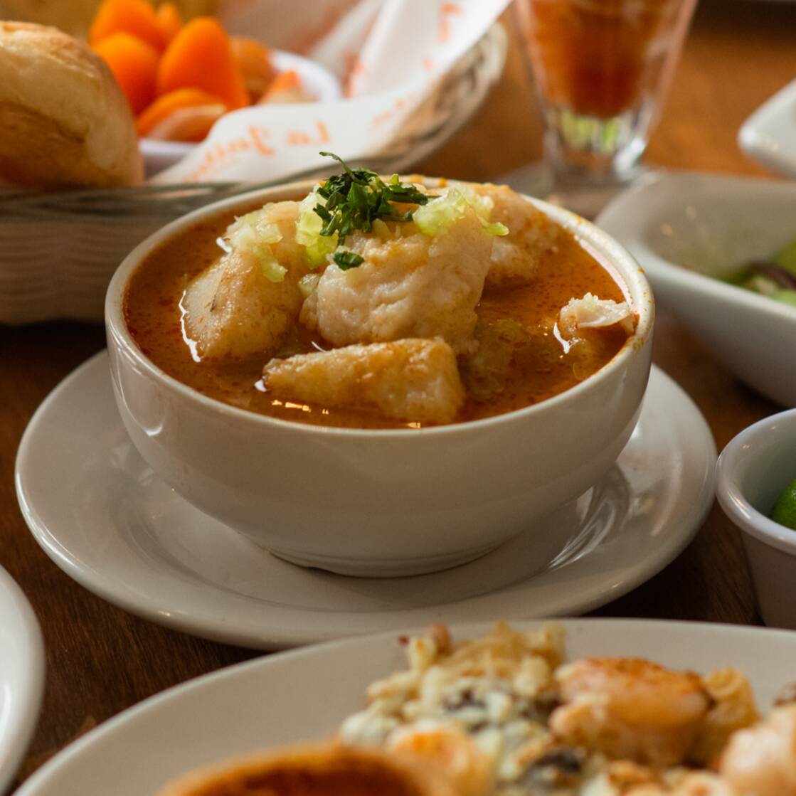1 litro de caldo de camarón, acompañado de pan, galletas ya salsa picante.