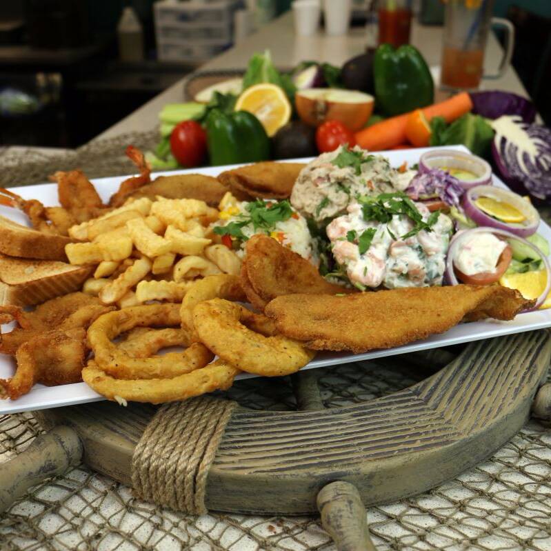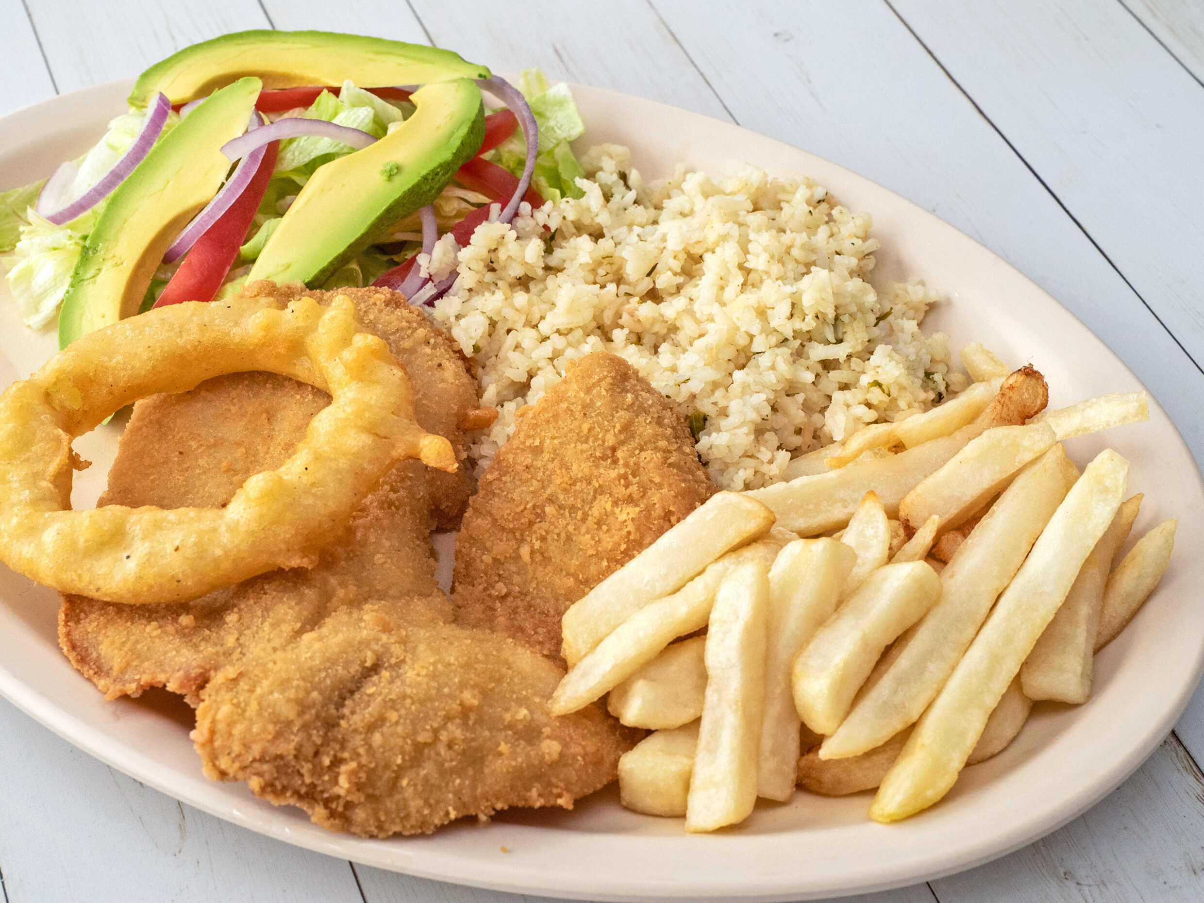 Charola Con Filete Empanizado, Camarones Empanizados, Papas Fritas, Aros De Cebolla, Ensalada Y Arroz