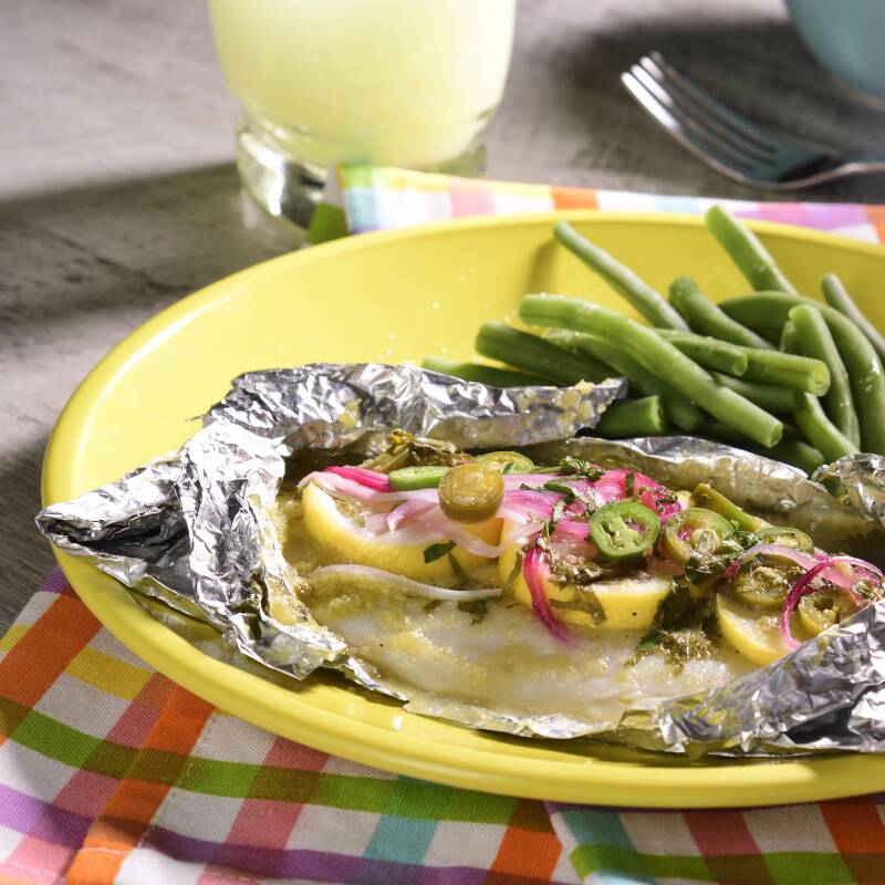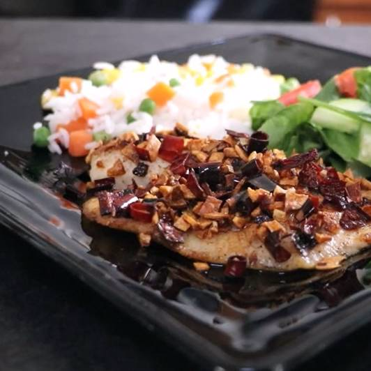 Delicioso filete de tilapia bañado en una salsa de chiles poblanos asados