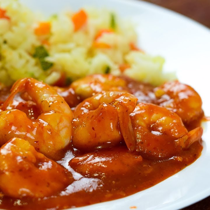 5 Camarones bañados en salsa a la diabla, arroz y verduras a la mantequilla (coliflor, brócoli y zanahoria).