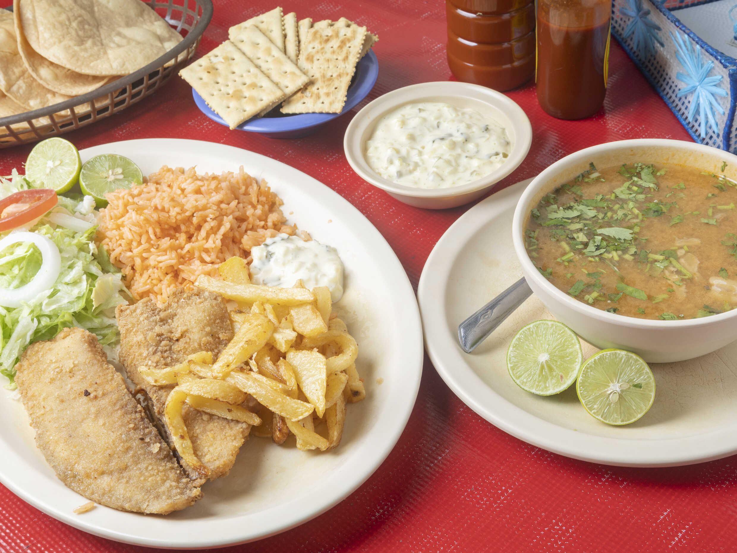 Filete empanizado y caldo de pescado.