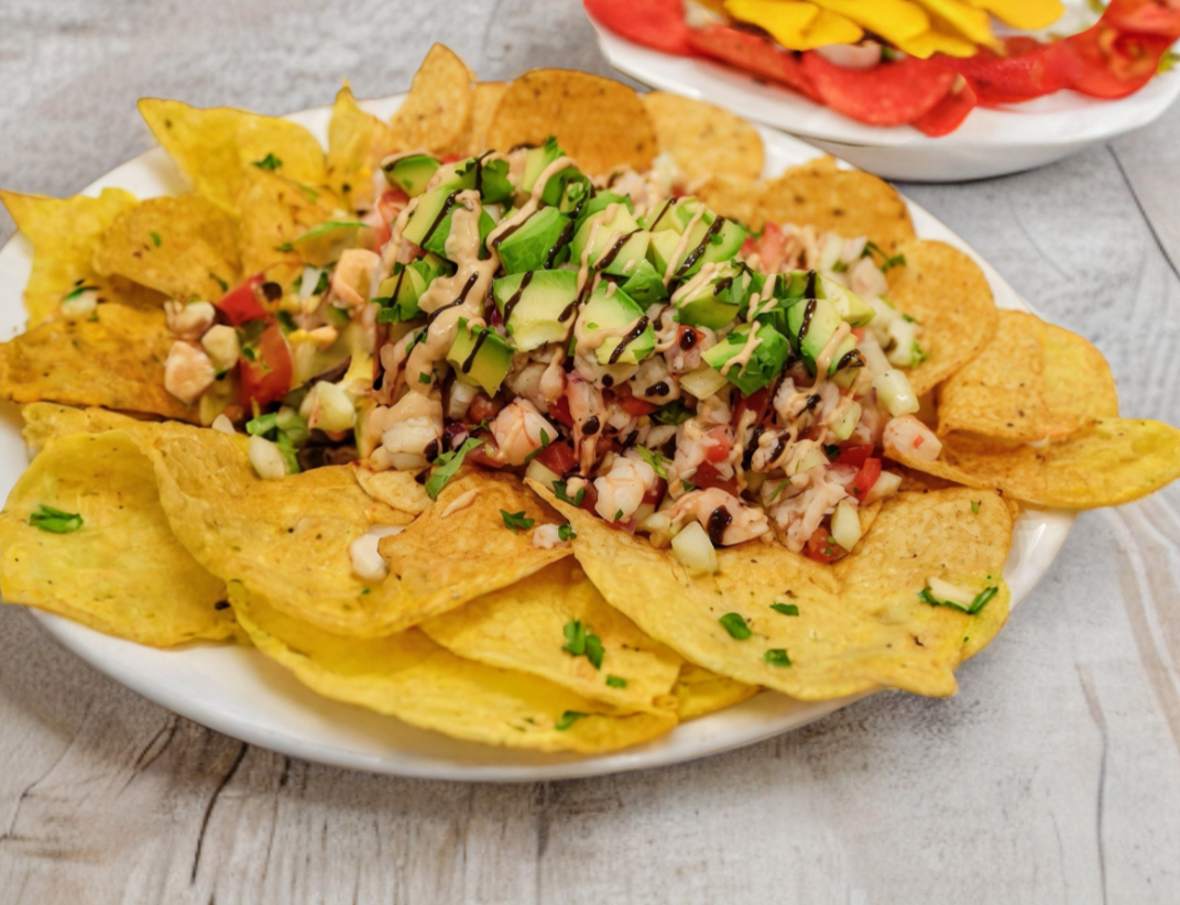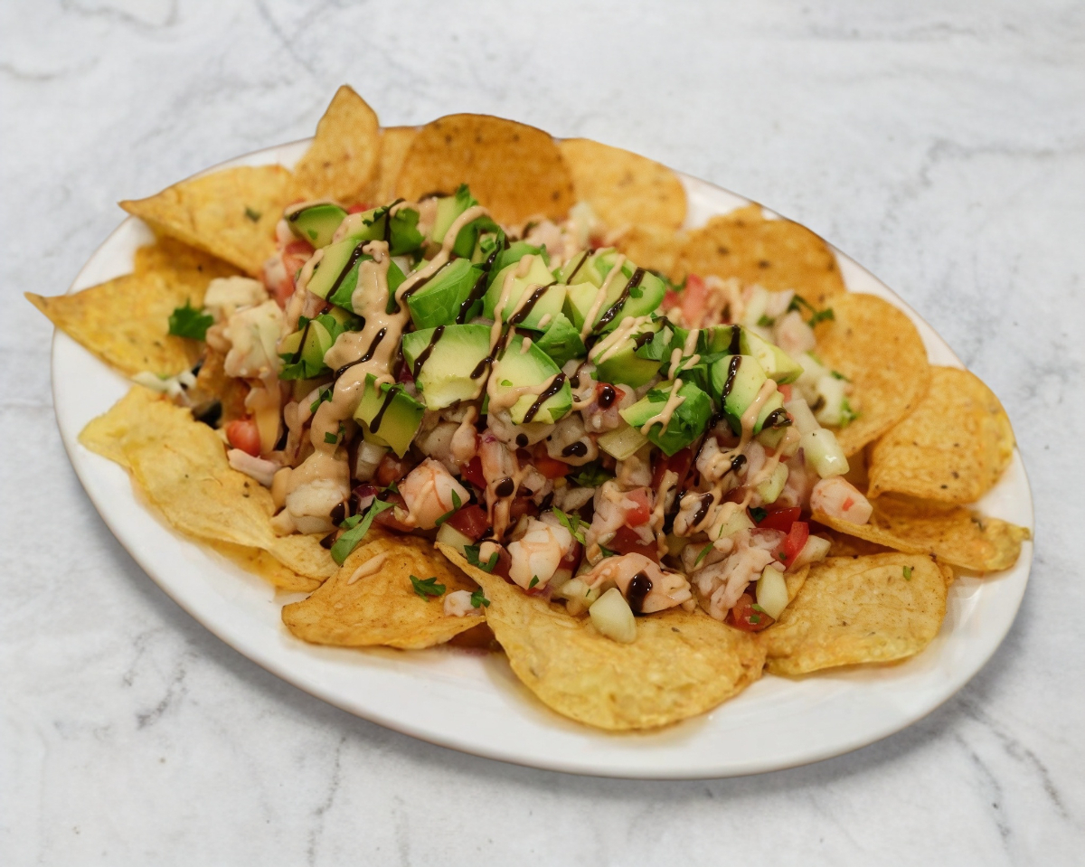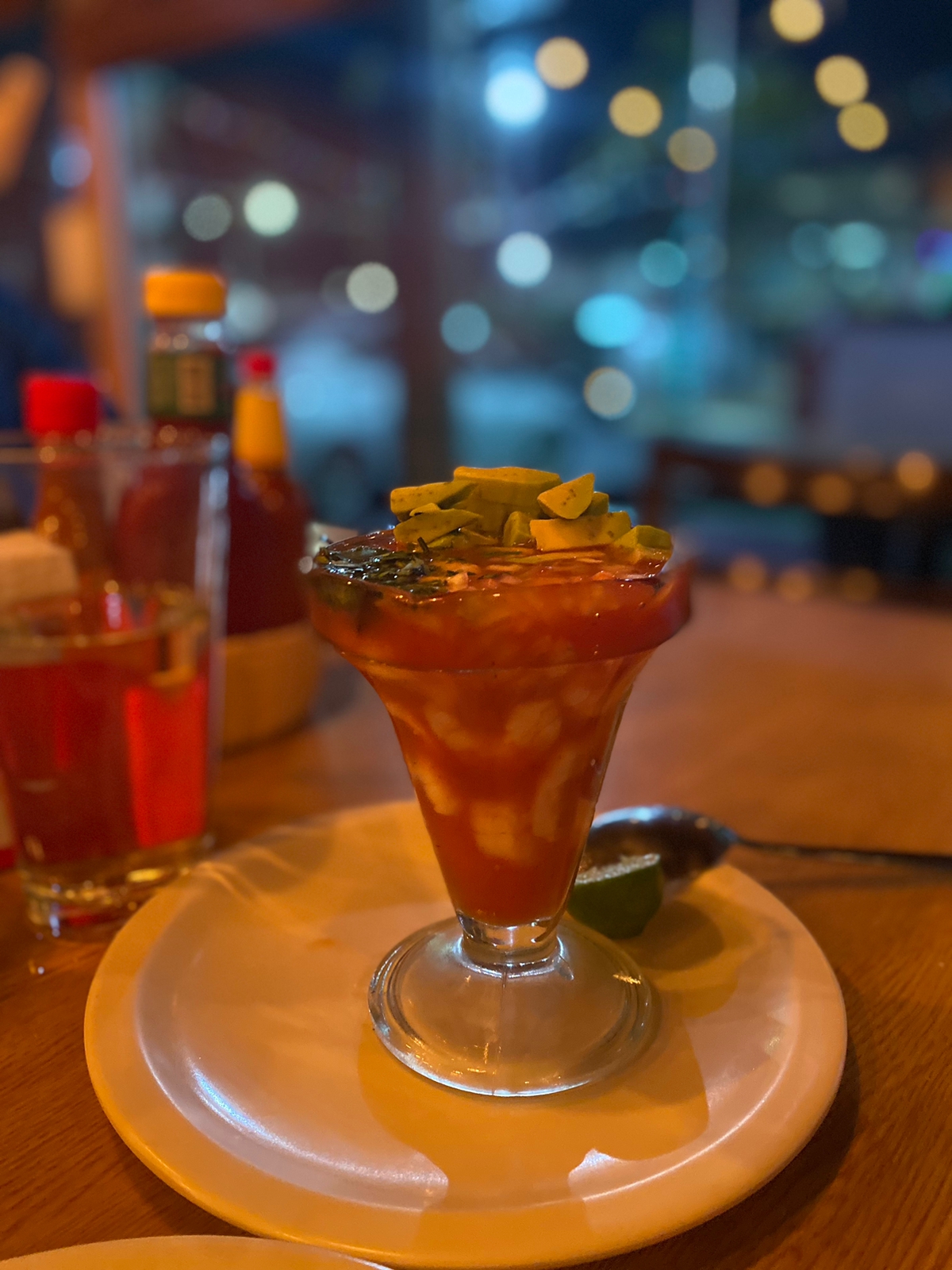 35gr de camarón y 35gr de pulpo en catsup, decorado con aguacate, cebolla y cilantro.