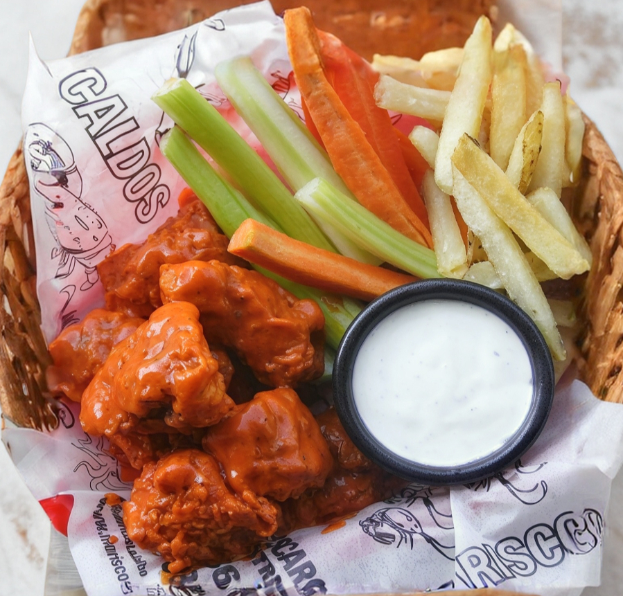 300 Gr de pechuga de pollo en cuadritos empanizado bañados en salsa buffalo, acompañado de papas a la francesa.