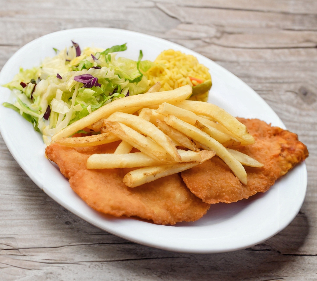 2 Piezas de filetes empanizados acompañado de papas a la francesa, arroz, aderezo y ensalada.