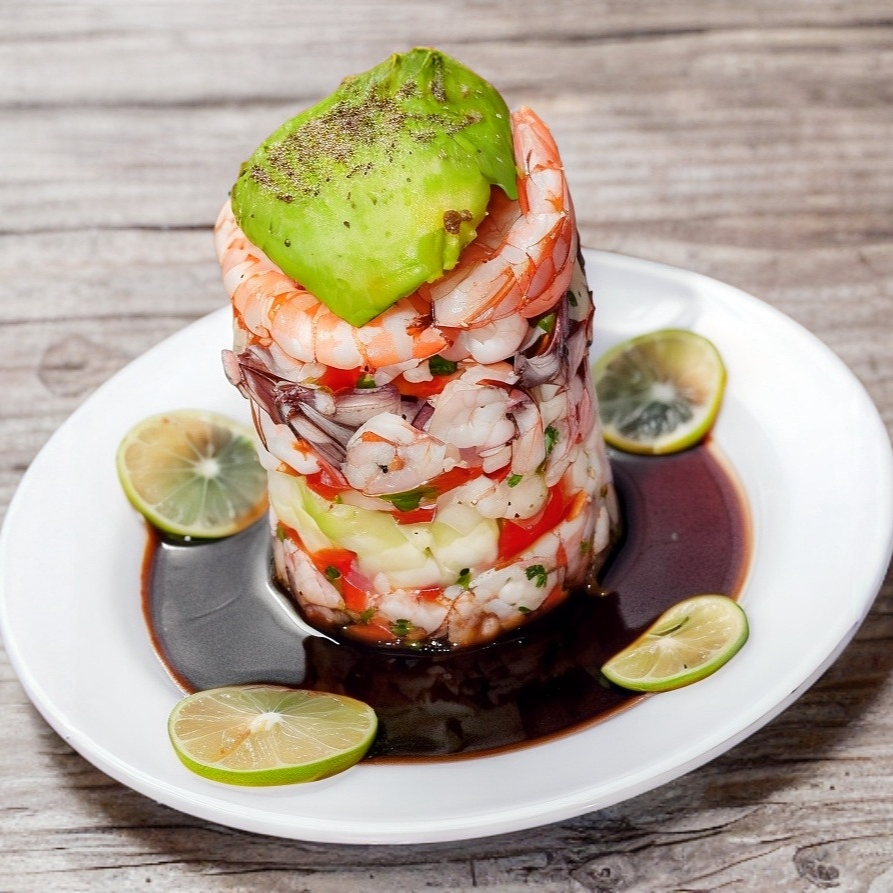 110gr de camarón en catsup, decorado con aguacate, cebolla y cilantro.