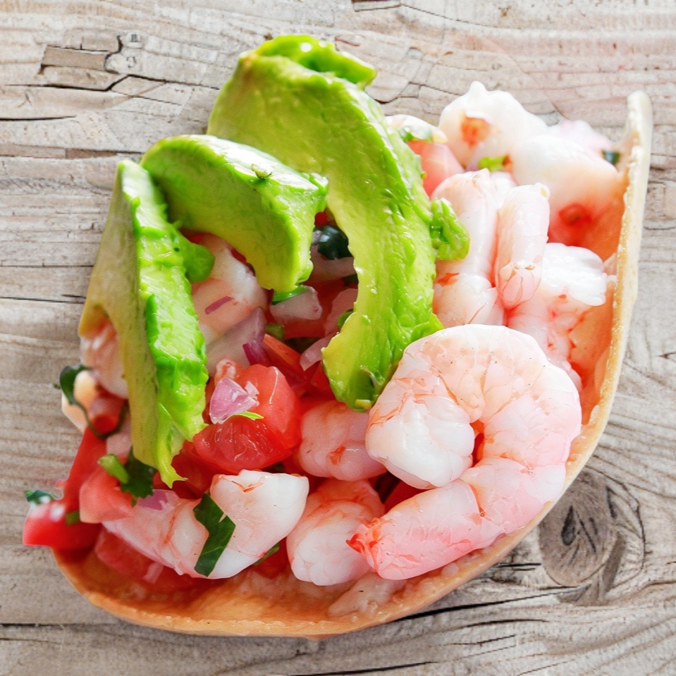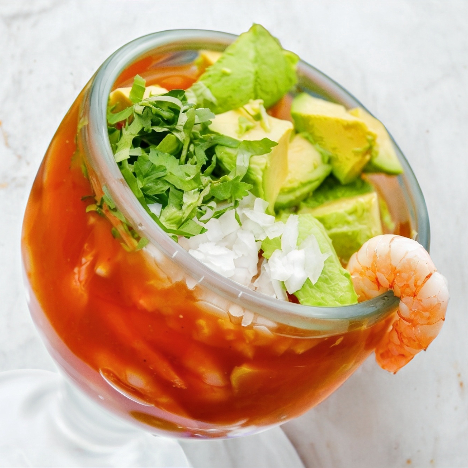60gr de camarón en catsup, decorado con aguacate, cebolla y cilantro.