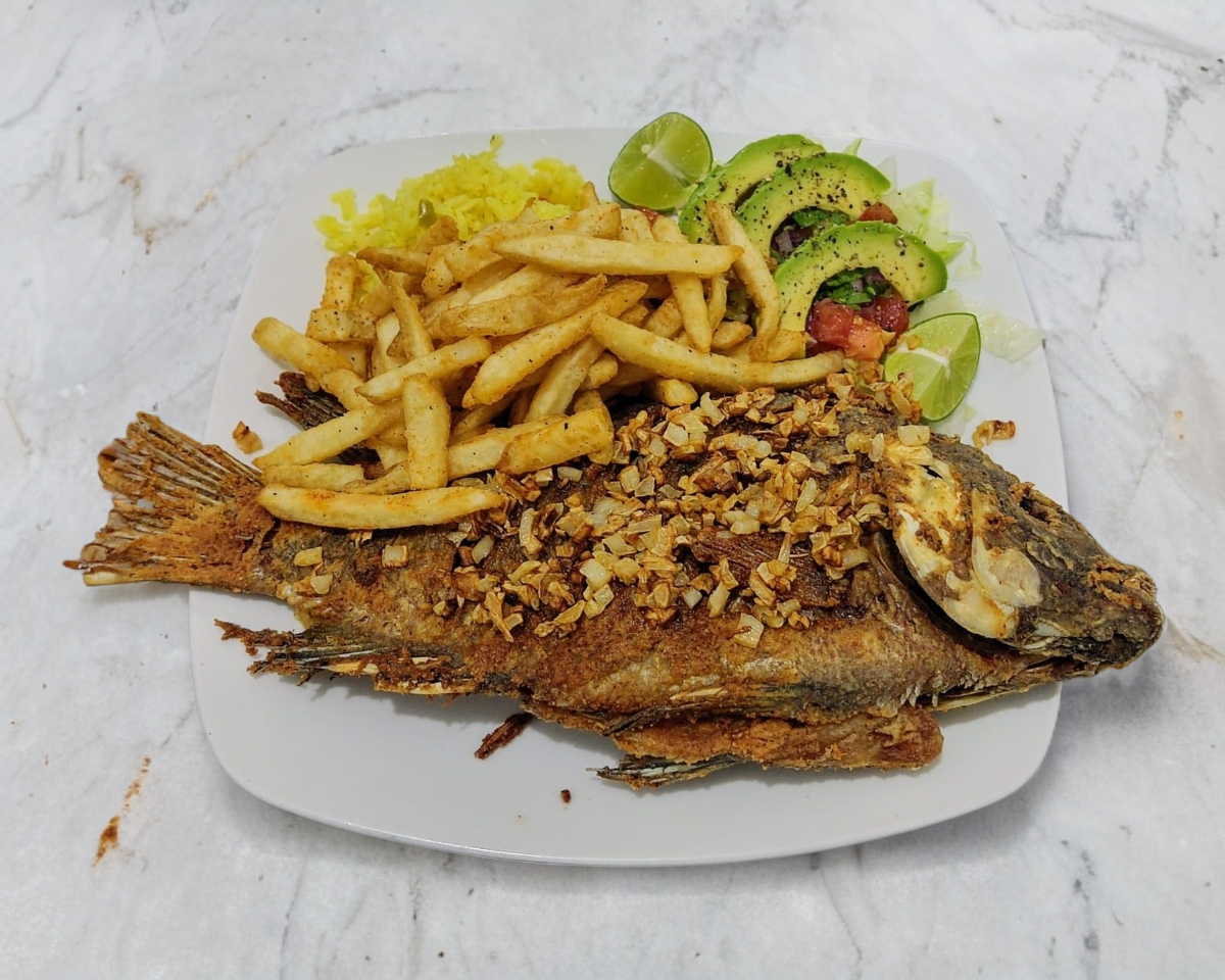 Mojarra frita al mojo de ajo, acompañada de arroz, ensalada y papas a la francesa.
