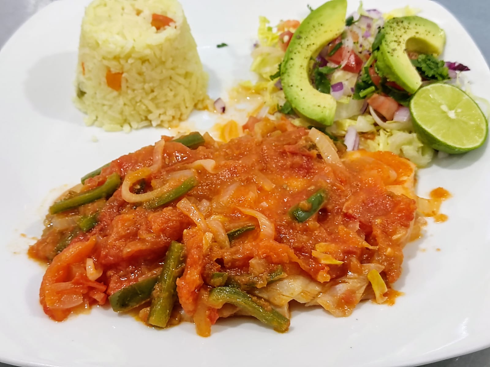 2 Piezas de filetes a la plancha bañados salsa de tomate, cebolla y chile jalapeño, acompañado de arroz, aderezo y ensalada.
