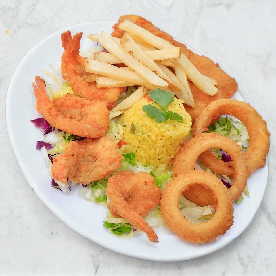 1 Filete empanizado, 4 camarones empanizados, 3 aros de cebolla, acompañado de arroz, ensalada y papas a la francesa.