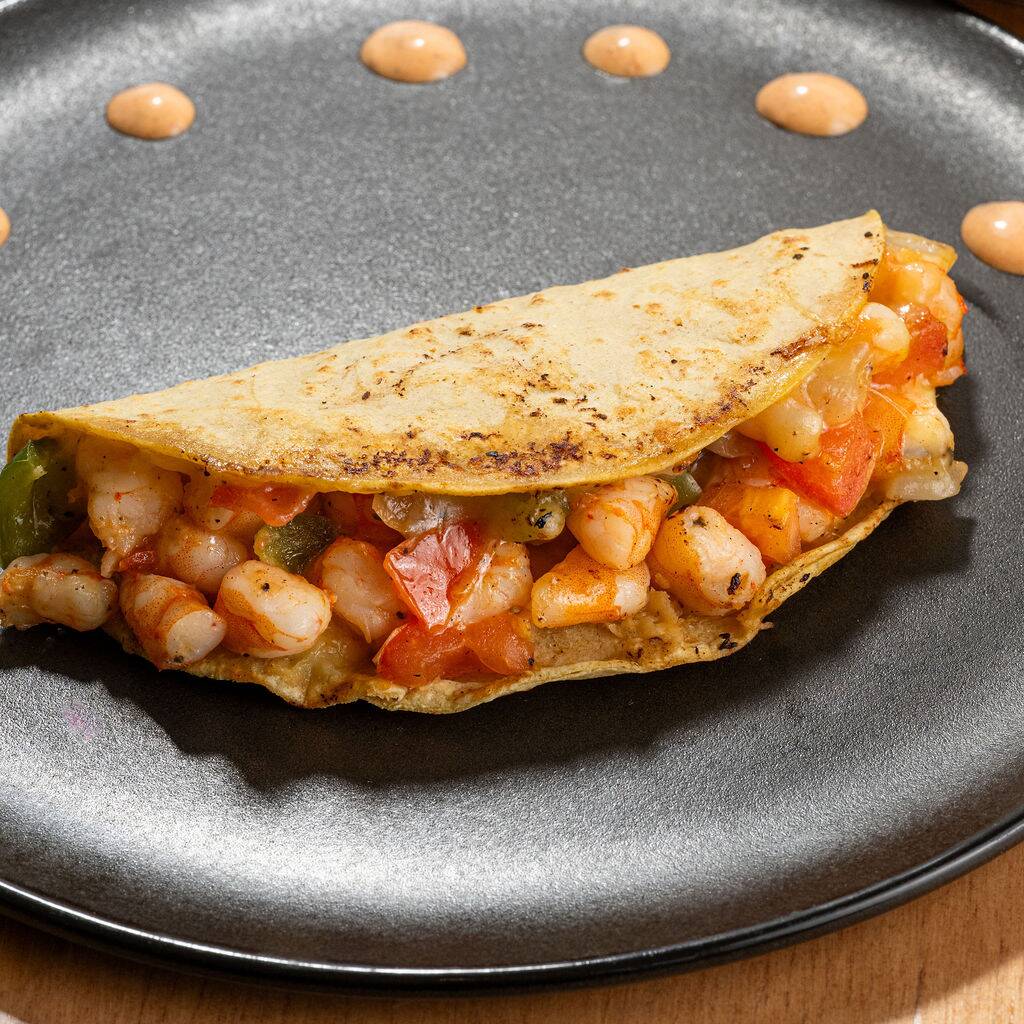 Camarones salteados con verduras y queso en tortilla dorada