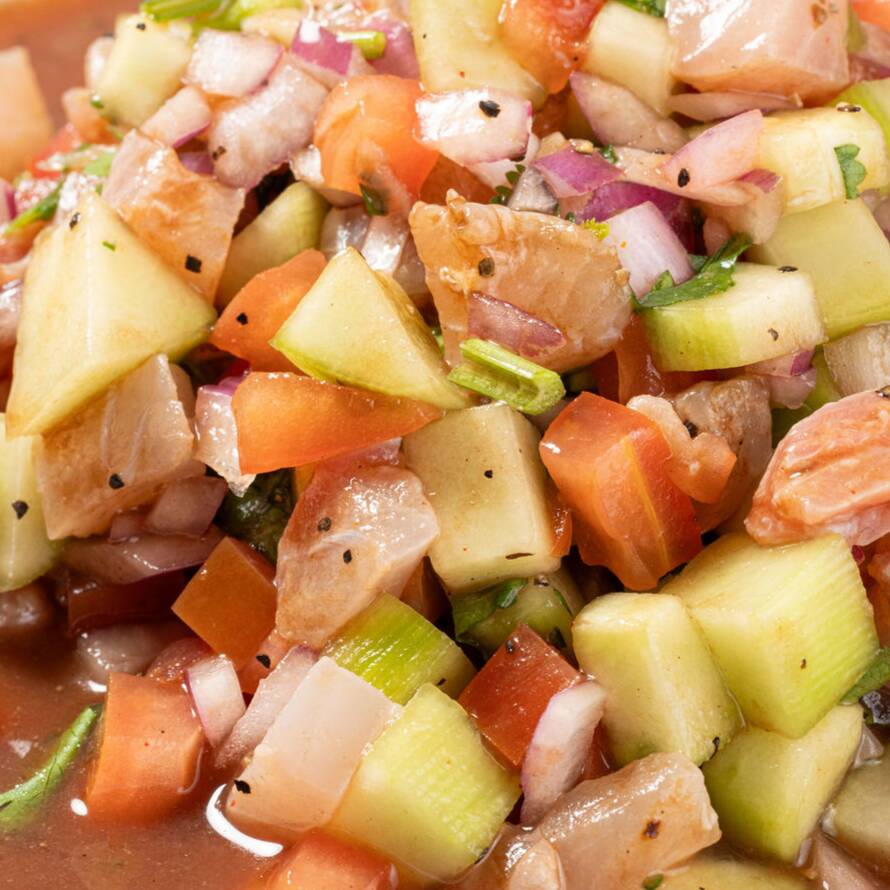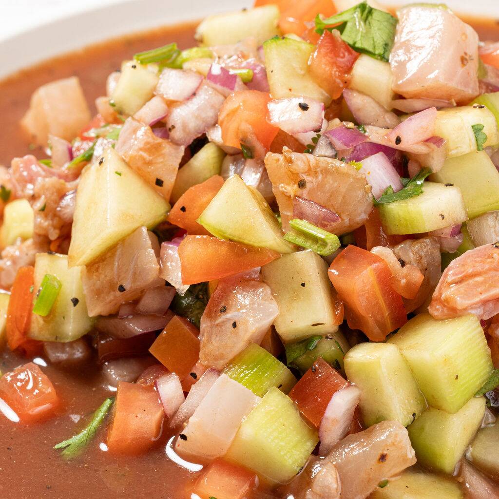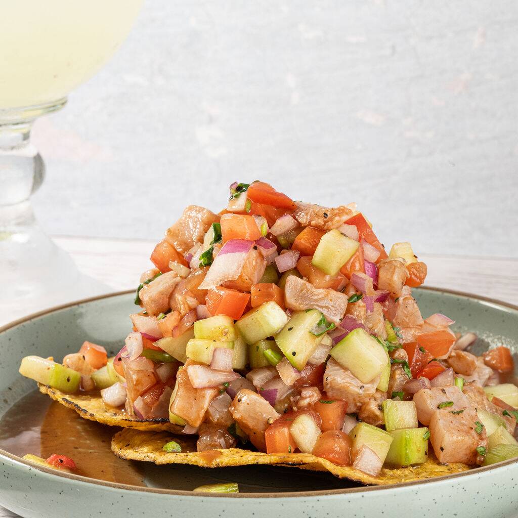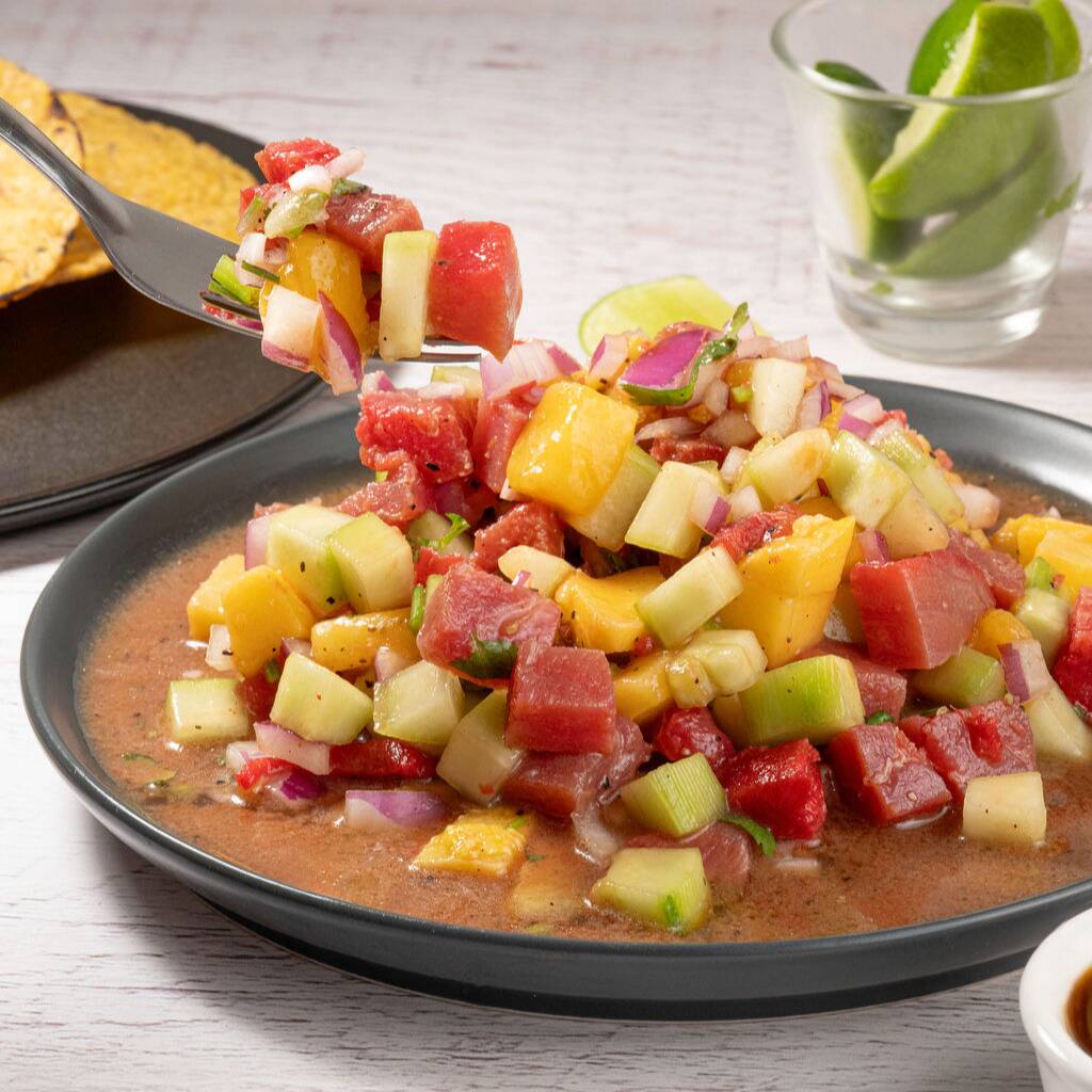 Ceviche de atún fresco, preparado con pepino, tomate, cebolla morada, cilantro y limón, acompañado con tostadas, salsa y aderezo.