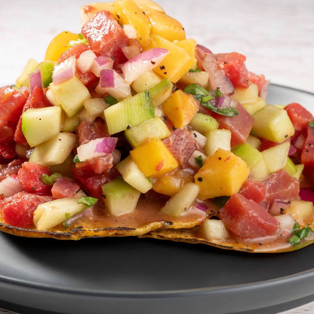 Tostada de ceviche de atún fresco, preparado con pepino, tomate, cebolla morada, cilantro y limón. Acompañado con salsa y aderezo.