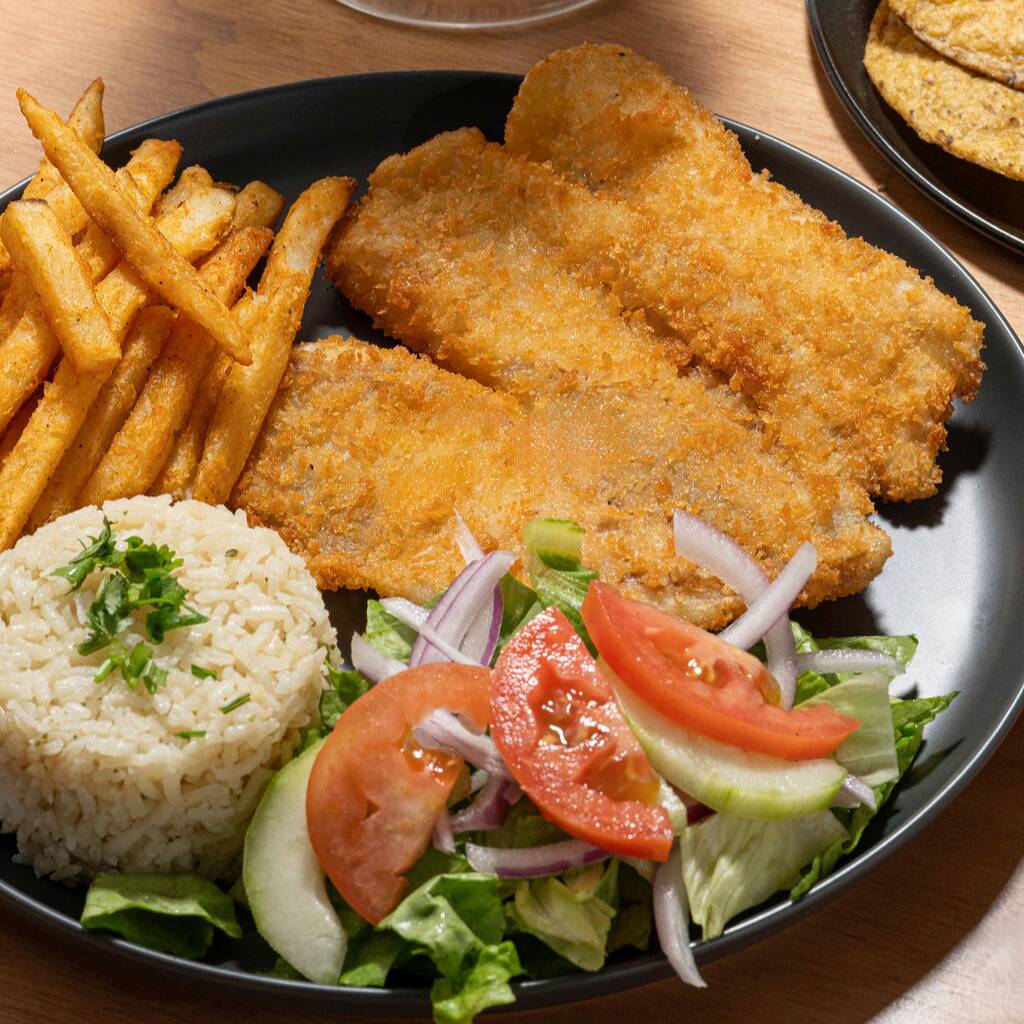 Filete de pescado fresco, empanizado y frito hasta quedar dorado y crujiente por fuera, suave por dentro. Acompañado con arroz, papas a la francesa y ensalada fresca. Un platillo completo, ideal para disfrutar con todo el sabor del mar.