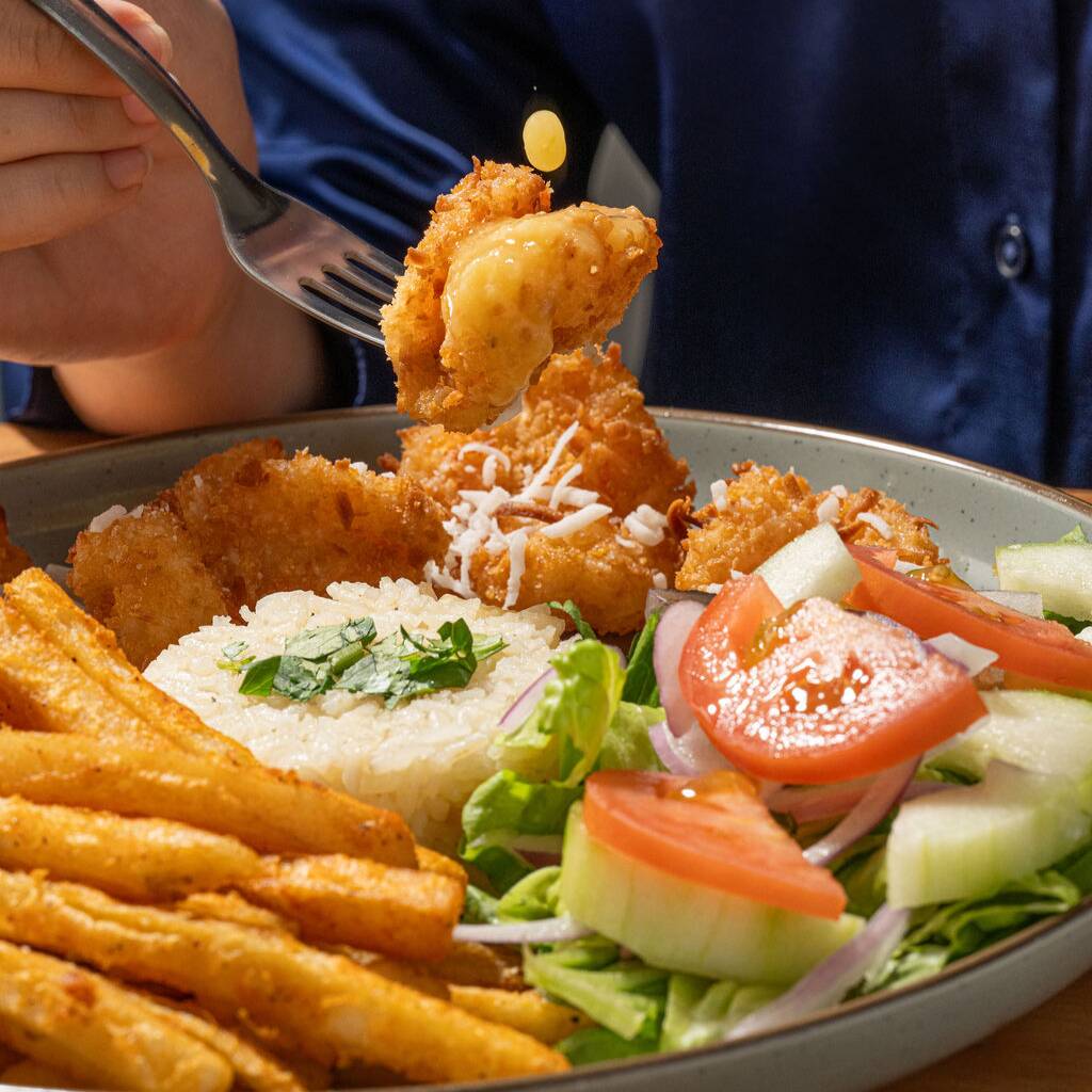 Camarones jugosos, empanizados y fritos a la perfección hasta lograr un dorado crujiente. Servidos con arroz, ensalada fresca, papas a la francesa y una salsa de mango habanero que resalta su sabor.