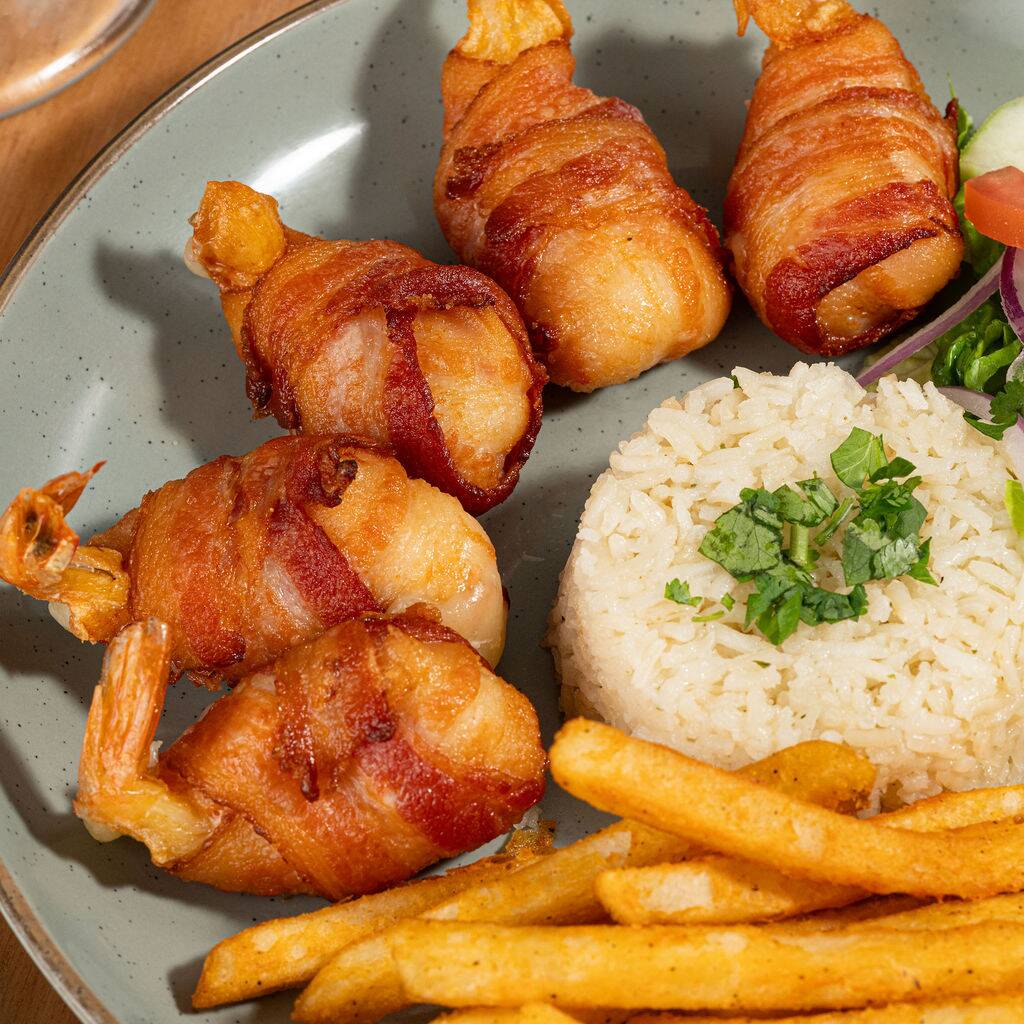 Camarones envueltos en tiras de tocino crujiente, rellenos de queso derretido y cocinados a la perfección. Acompañados con arroz, ensalada fresca y papas a la francesa. Un platillo irresistible con el equilibrio perfecto entre sabor y textura.