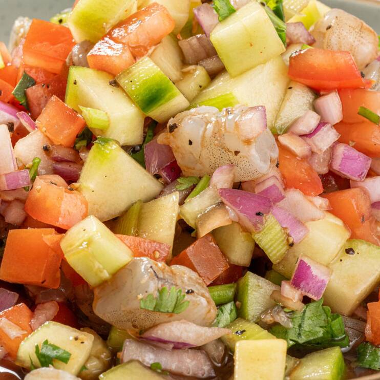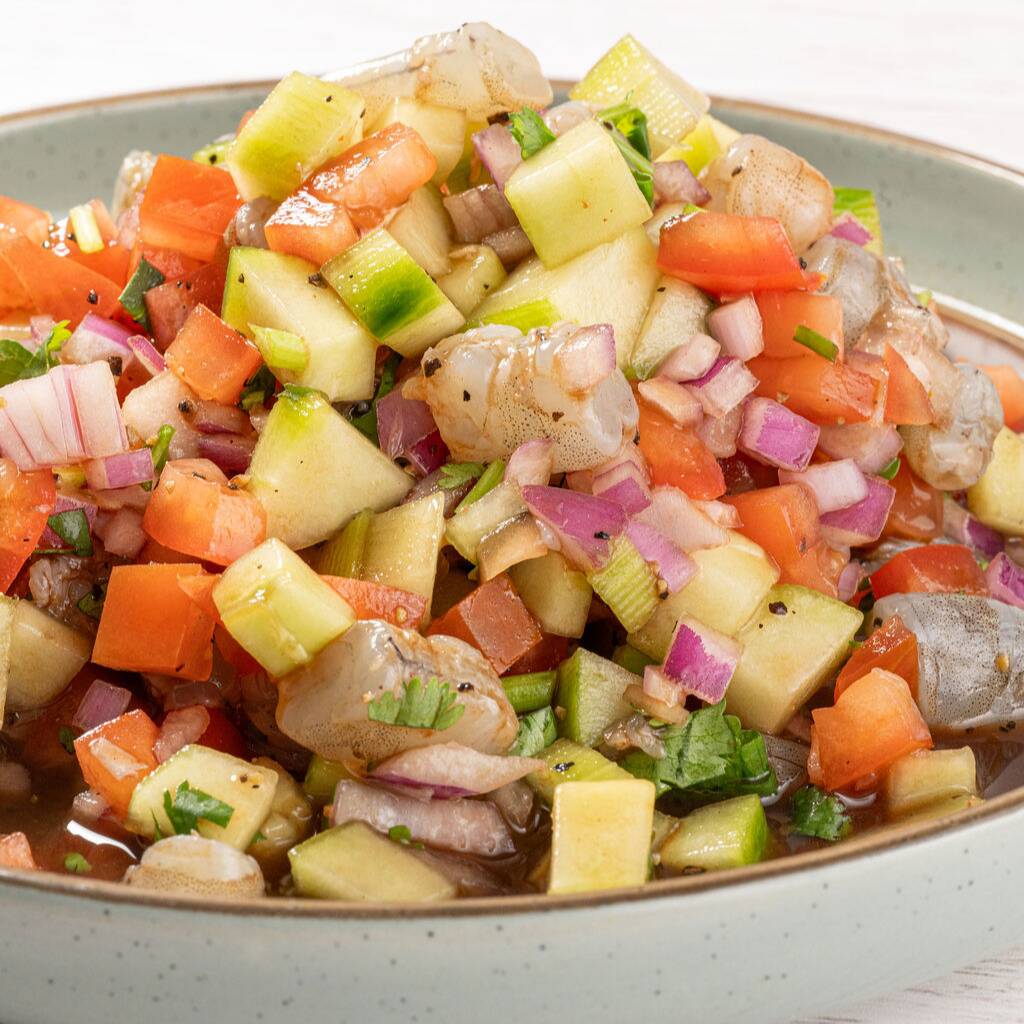 Ceviche de camarón fresco, preparado con pepino, tomate, cebolla morada, cilantro y limón, acompañado con tostadas, salsa y aderezo.