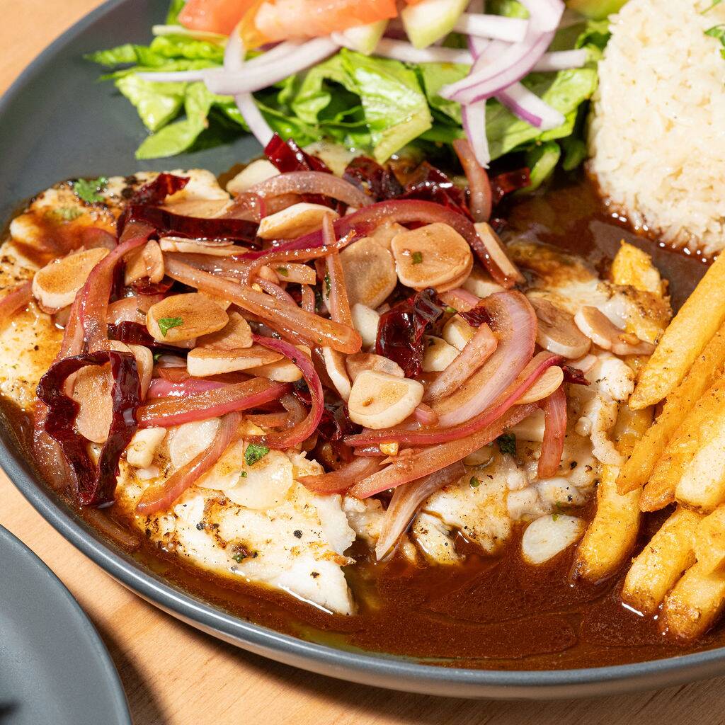 Camarones salteados en mantequilla con abundante ajo dorado, que potencia su sabor y aroma. Acompañados con arroz, ensalada fresca y papas a la francesa. Un platillo lleno de tradición y sabor casero.
