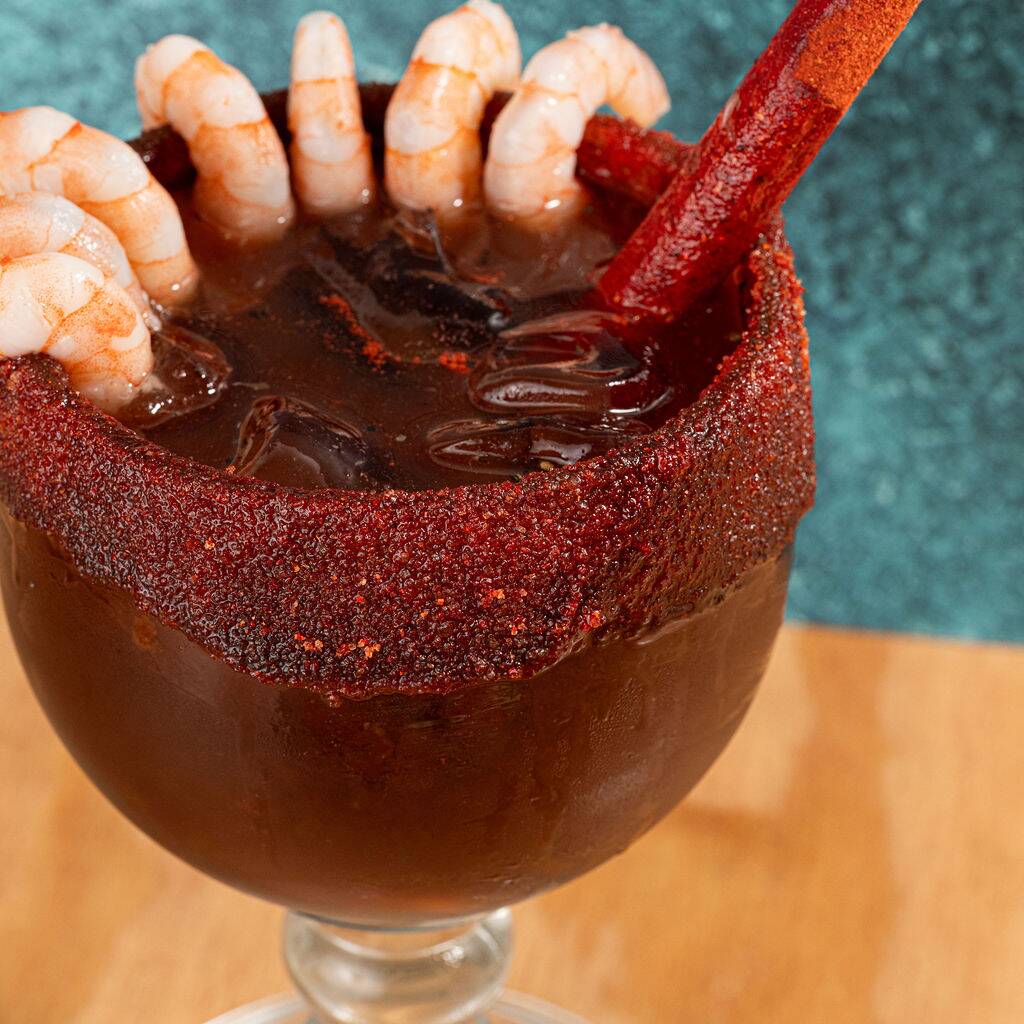 Refrescante mezcla de jugo de tomate, limón, salsas, especias y un toque de picante. Servido bien frío y decorado con camarones y botanita al estilo de la casa. Intenso, sabroso y perfecto para abrir el apetito.
