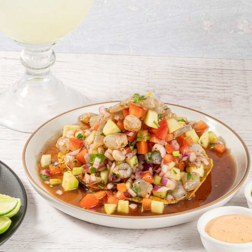 Tostada de ceviche de camarón fresco, preparado con pepino, tomate, cebolla morada, cilantro y limón,. Acompañado con salsa y aderezo.