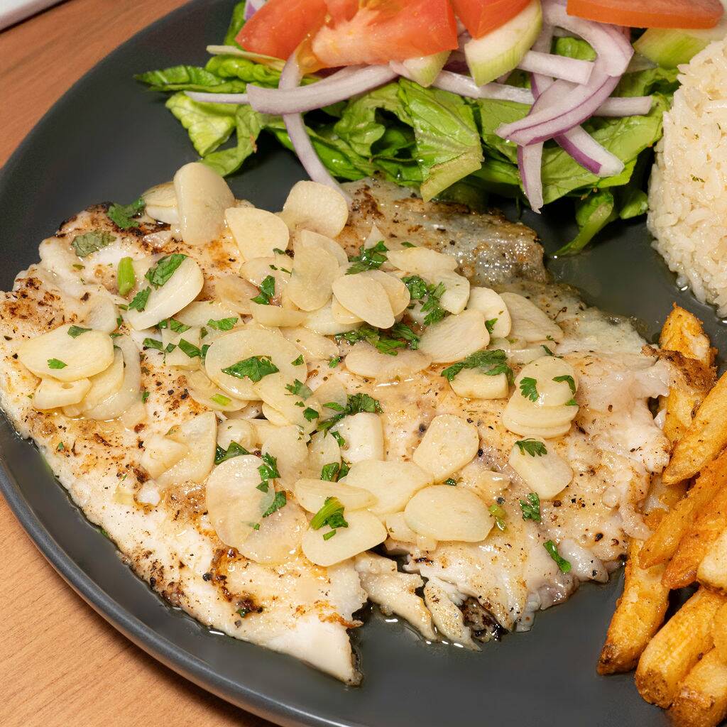 Filete en salsa de ajo dorado con mantequilla, arroz, ensalada y papas.