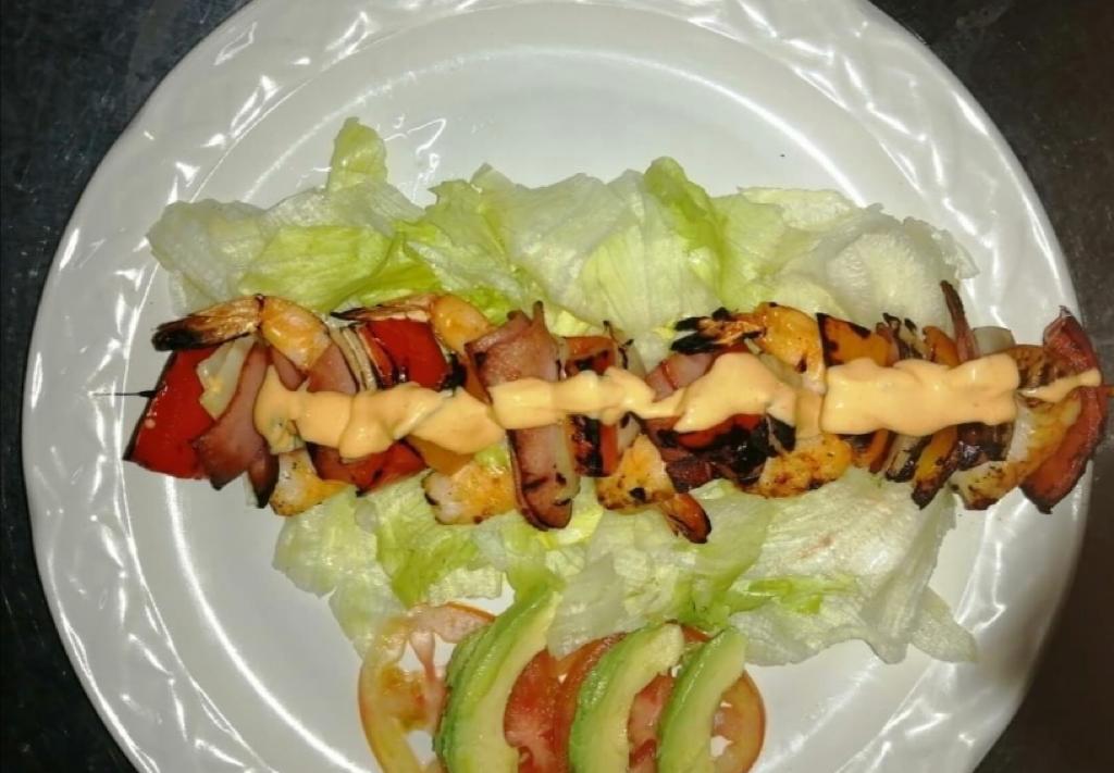 5 camarones acompañados de chile morrón, cebolla y tocino.
