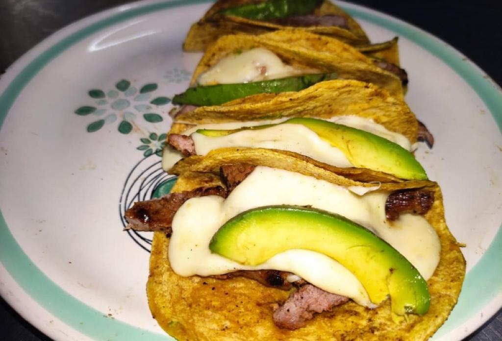 5 Tacos de maíz con carne de arrachera, si gusta puede ponerse fundido arriba.