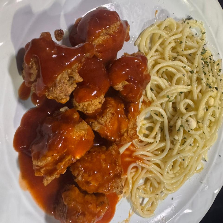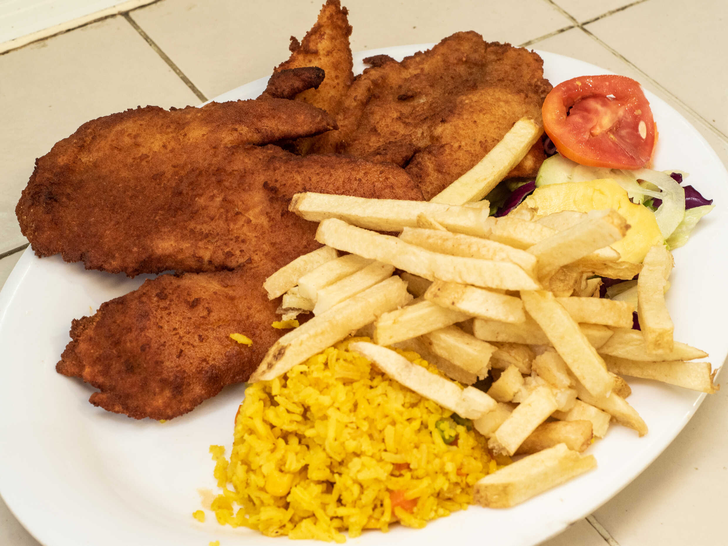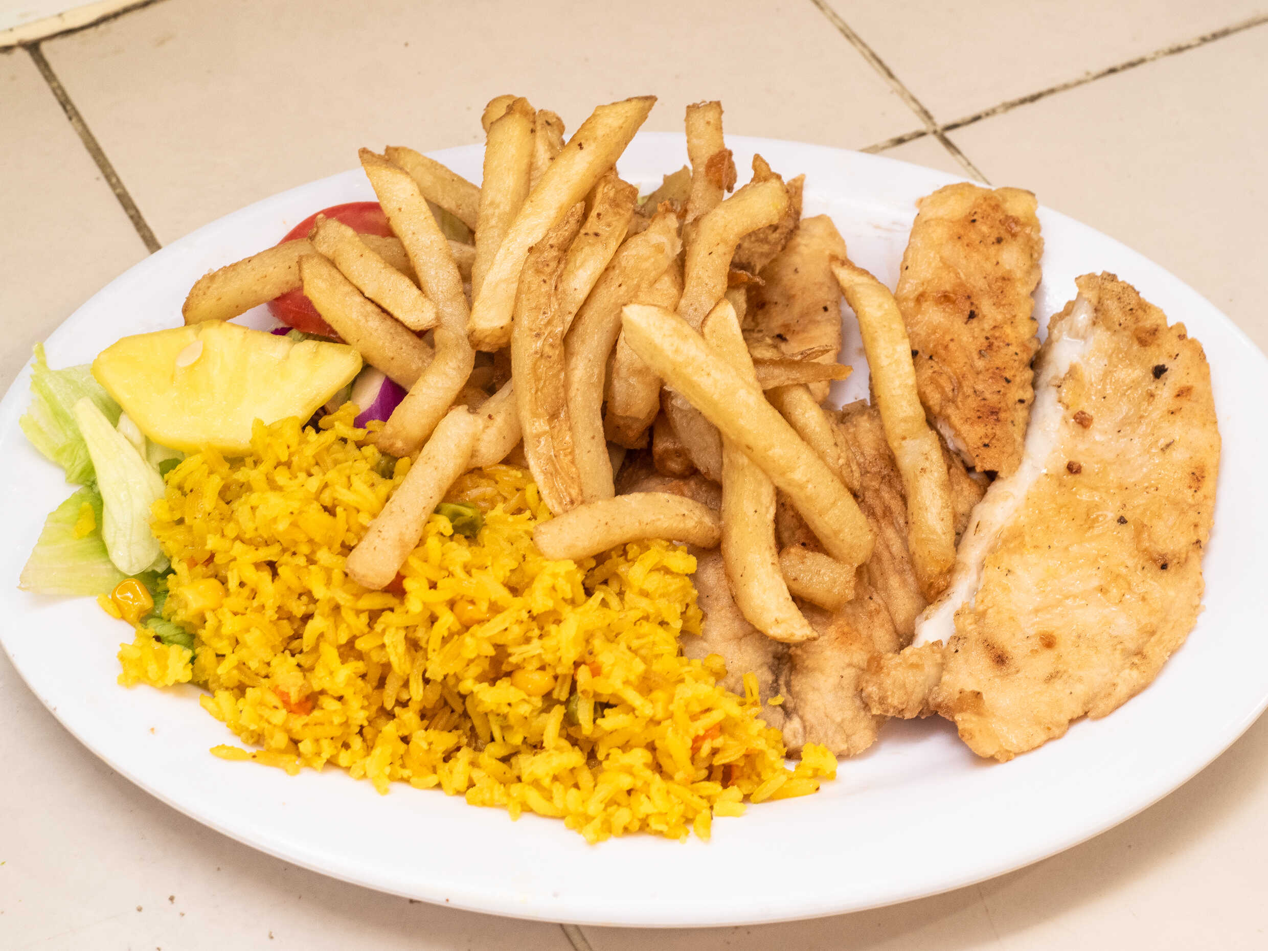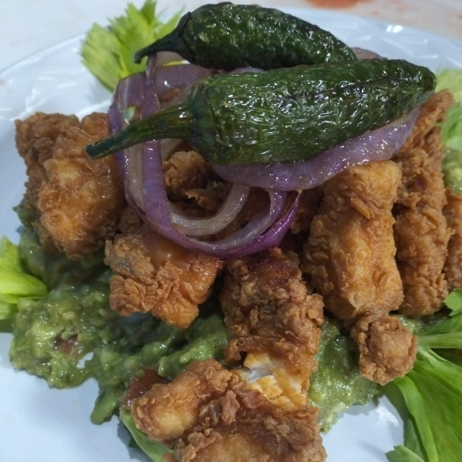 Filete de tilapia empanizado de harina dándole un toque estilo chicharrón acompañado de ensalada, aderezo, arroz, salsa, limones, totopos.