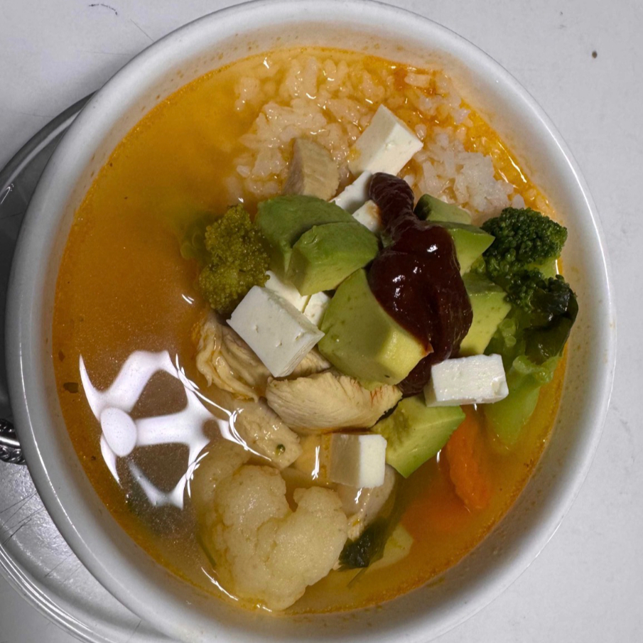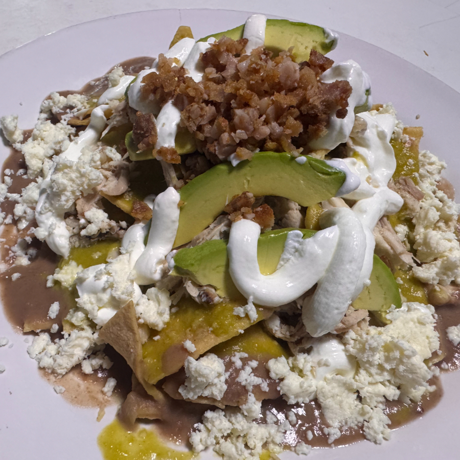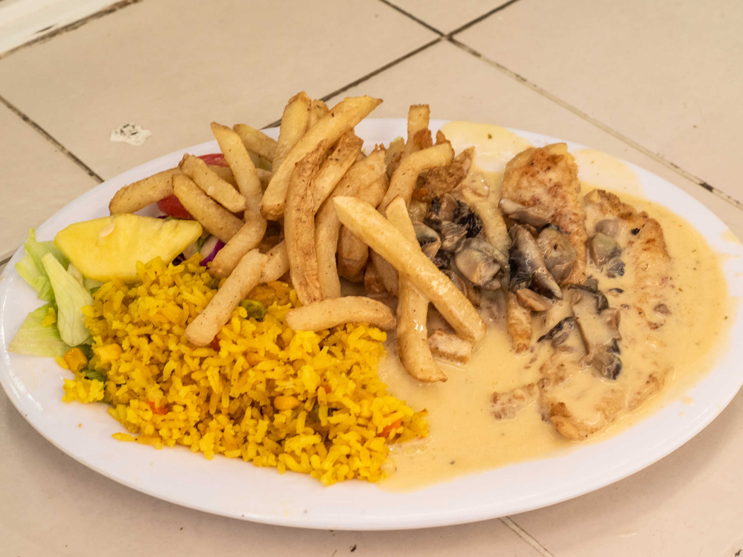 A la plancha bañado con una salsa de chile poblano arroz, ensalada, totopos, aderezo, salsa.