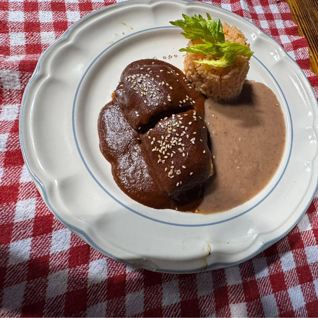 MOLE DE EPOLO CON TORTILLAS RECIEN ECHAS ACOMPAÑADO DE FRIJOLES Y AROZ