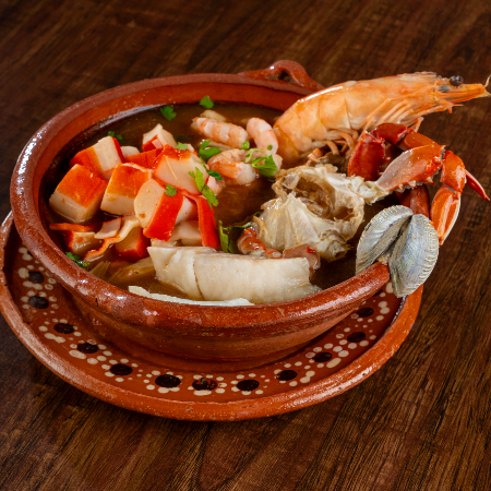 Filete de pescado, camarón, calamar, jaiba y almeja.