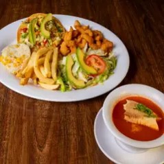 Ideal para compartir: 11 tiras de filete + orden de chicharrón de pescado + camarones empanizados + camarones rellenos de queso y tocino + rollos de filete + tostada de ceviche de pescado + tostada de camarón + aros de cebolla + orden de arroz, papas y ensalada.