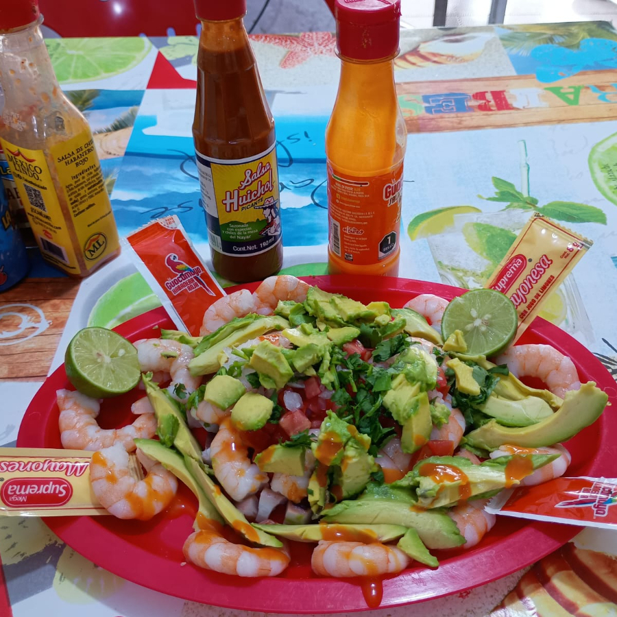 Camaron acompañado con pico de gallo, aguacate y concentrado de la casa.
