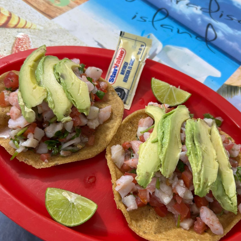 Tostitos con ceviche y una porcion de camaron acompañado con aguacate.