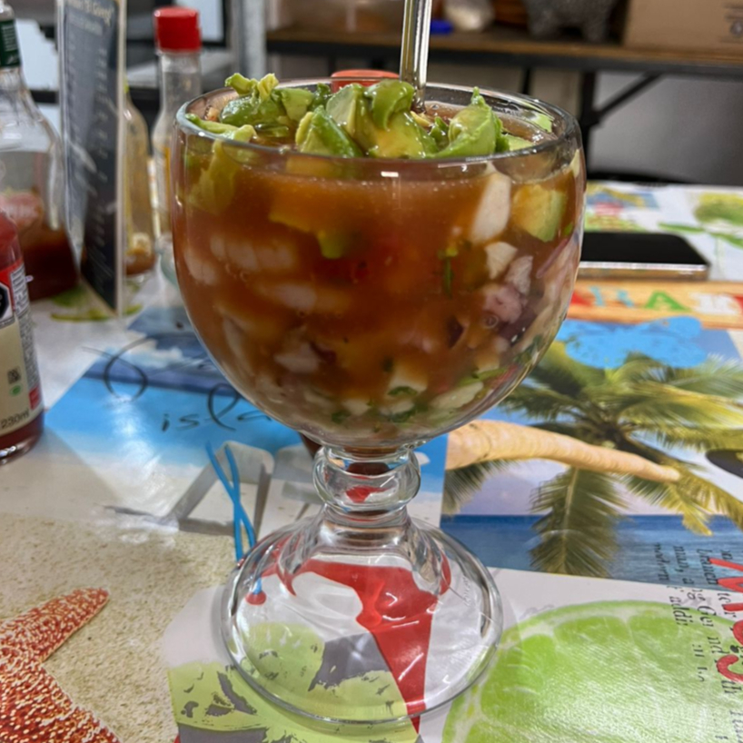 Medio litro de Camaron y ceviche acompañado con pico de gallo, aguacate y concentrado de la casa.