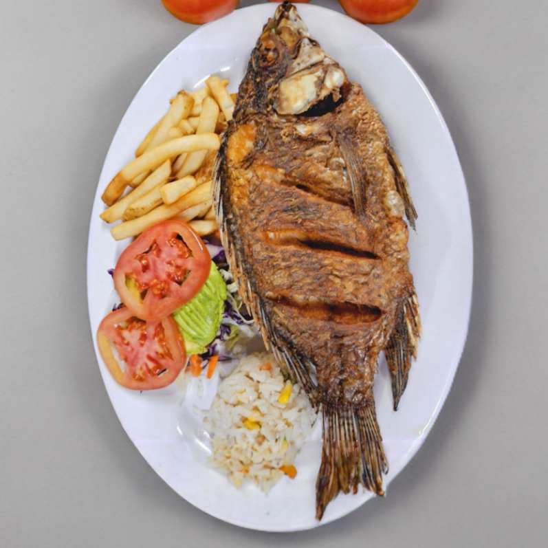 La favorita, la mojarra frita acompañada de arroz, papas y ensalada.