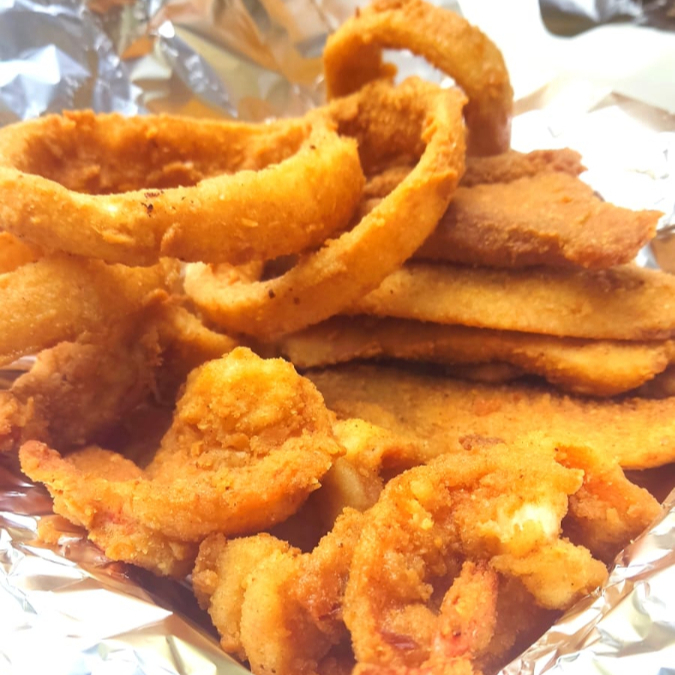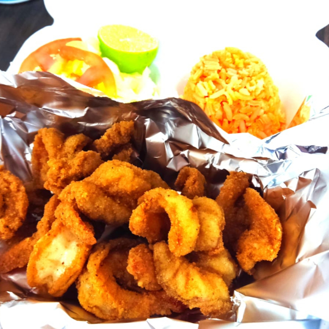 Filete de pescado, Camarones empanizados y rellenos, aros de cebolla mas complementos,