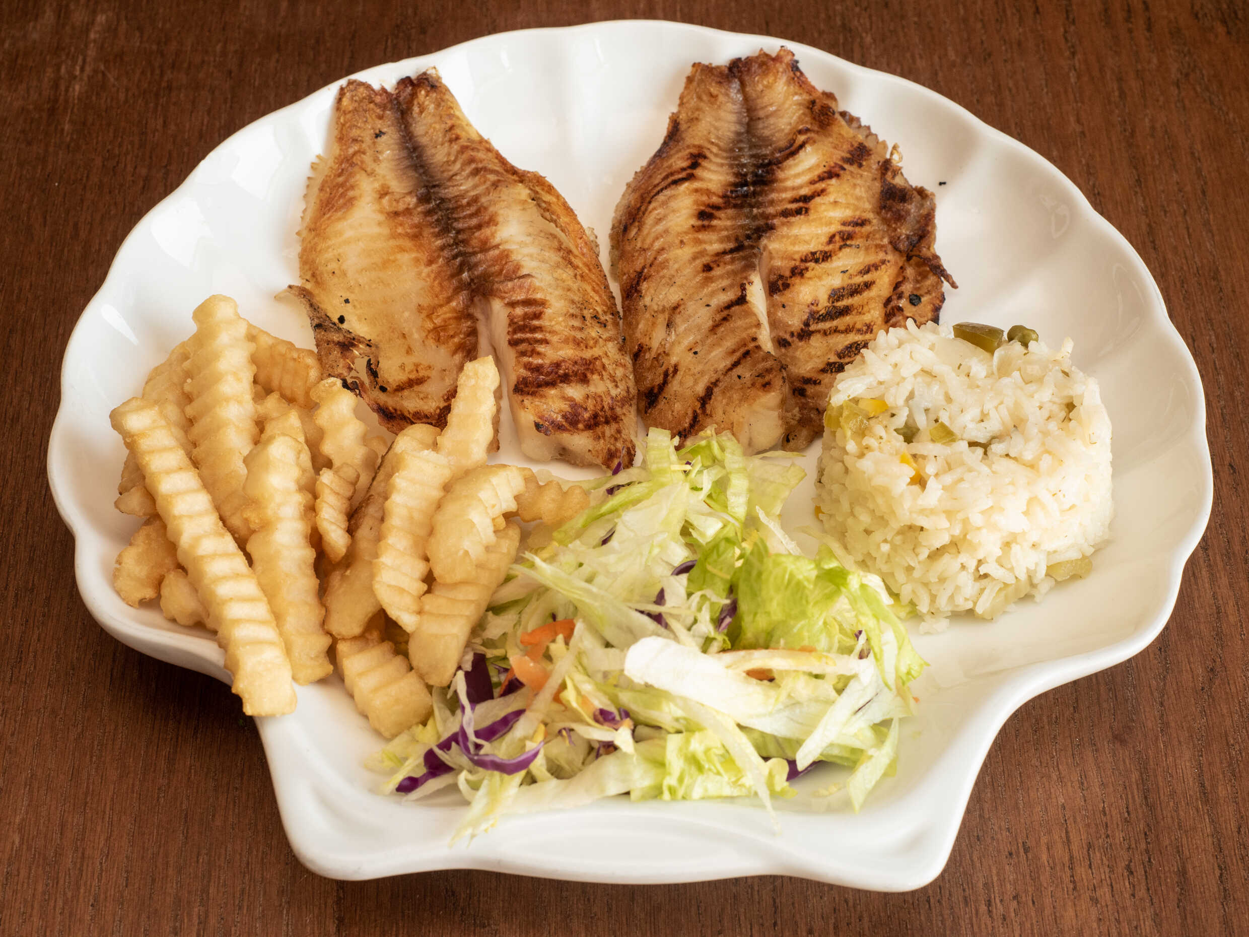 2 Filetes de pescado , 4 camarones empanizados, 4 Aros de Cebolla , 2 Camarones rellenos , Papas a la Francesa y verdura fresca