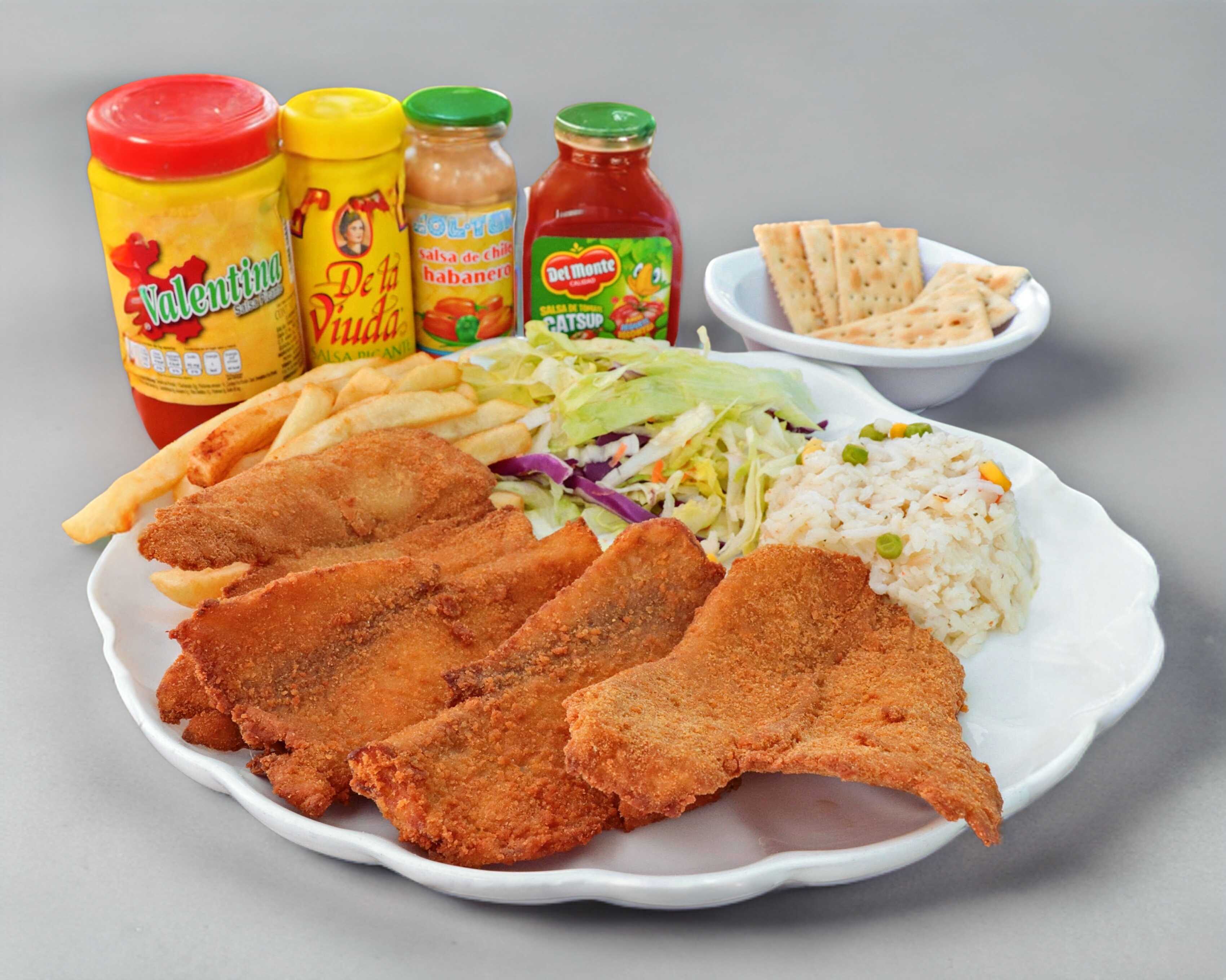 Exquisito y crujiente filete de pescado empanizado acompañado de arroz, papas y ensalada.