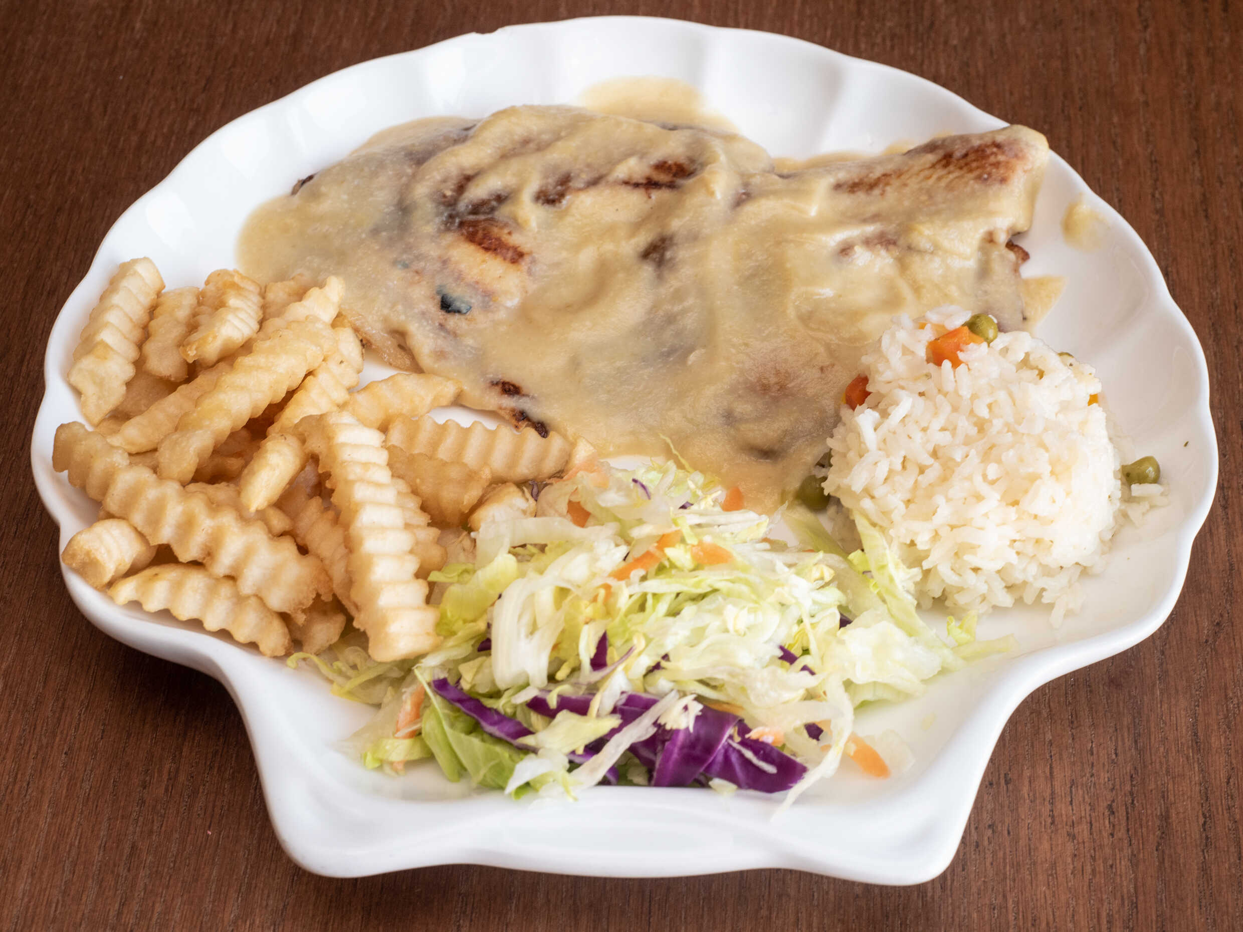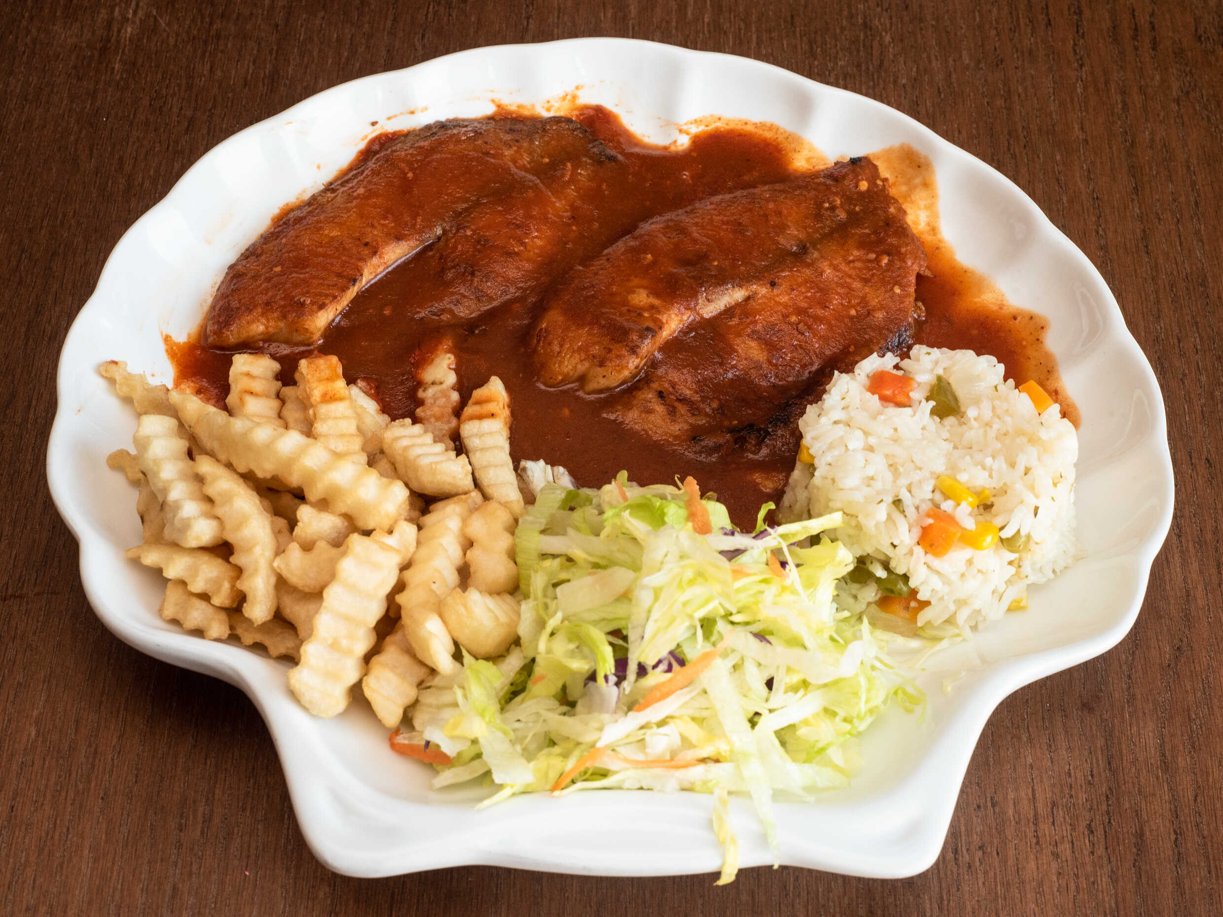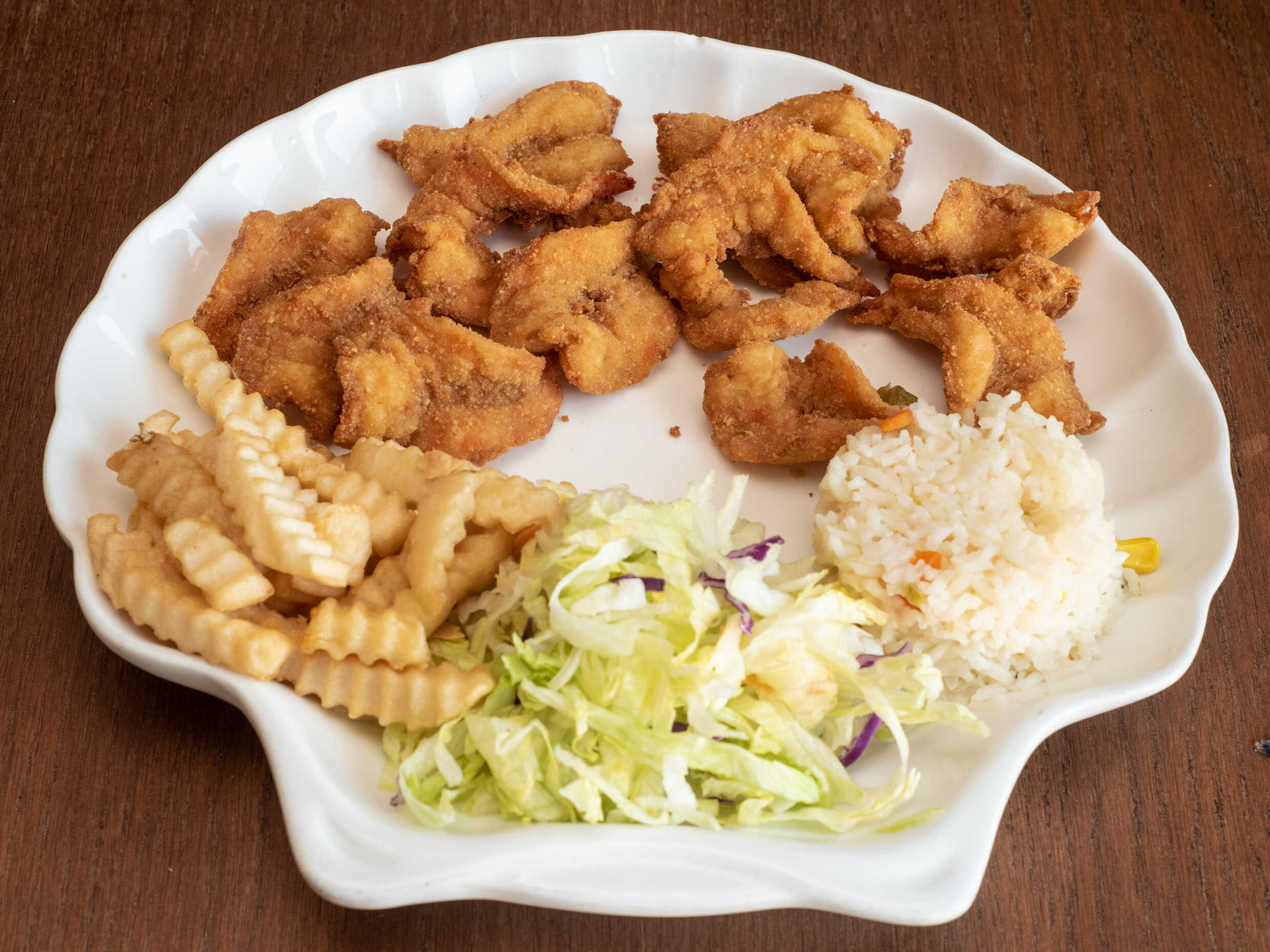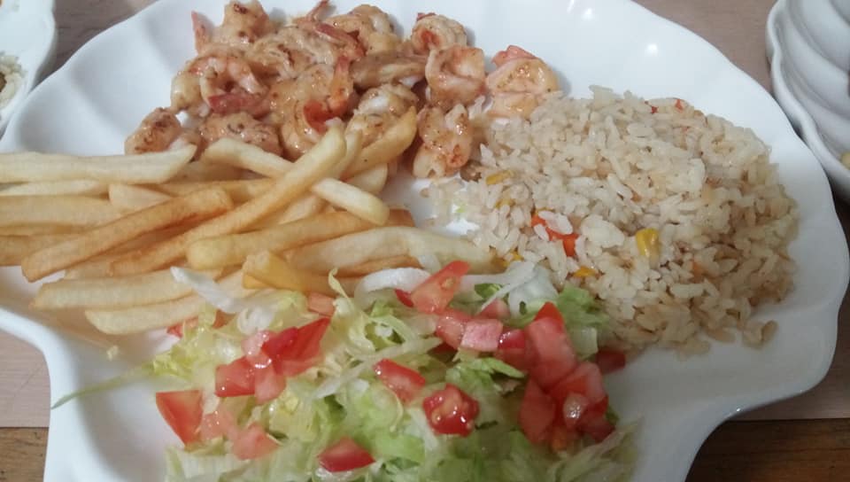 Filete de pescado, camarón empanizados, aros de cebolla, arroz, papas a la francesa y verdura.