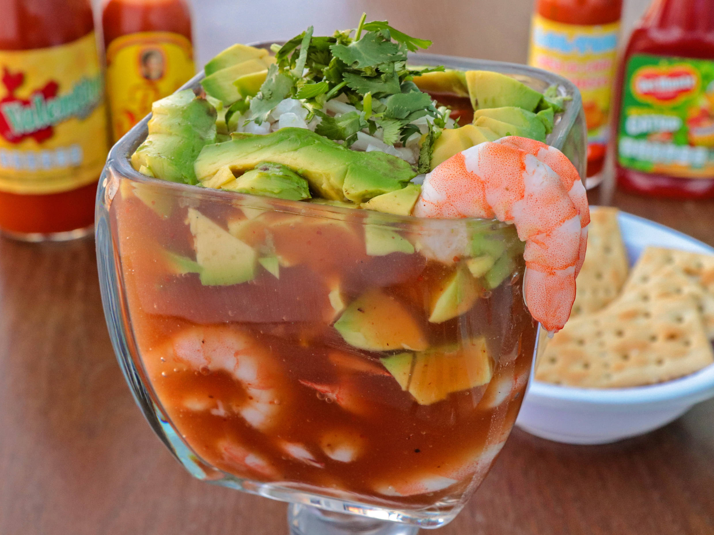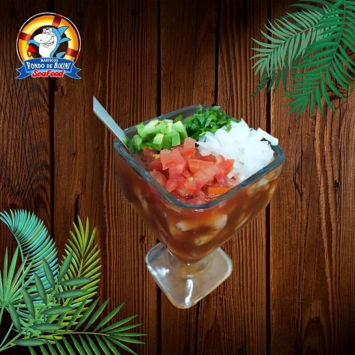 Exquisito cóctel de camarón con nuestro sabor típico de fondo de bikini.