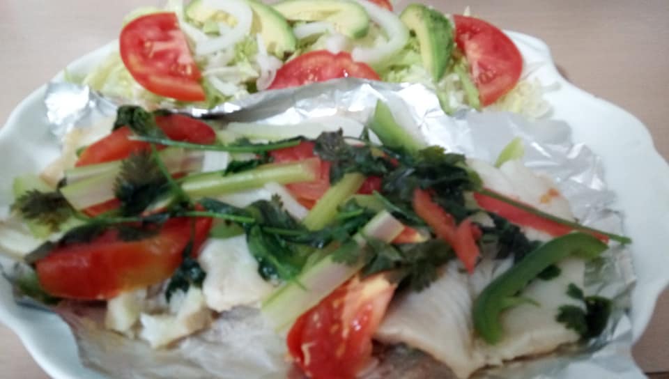 Exquisito filete de pescado cocido al vapor con finas hierbas que le da ese toque de fondo de bikini.