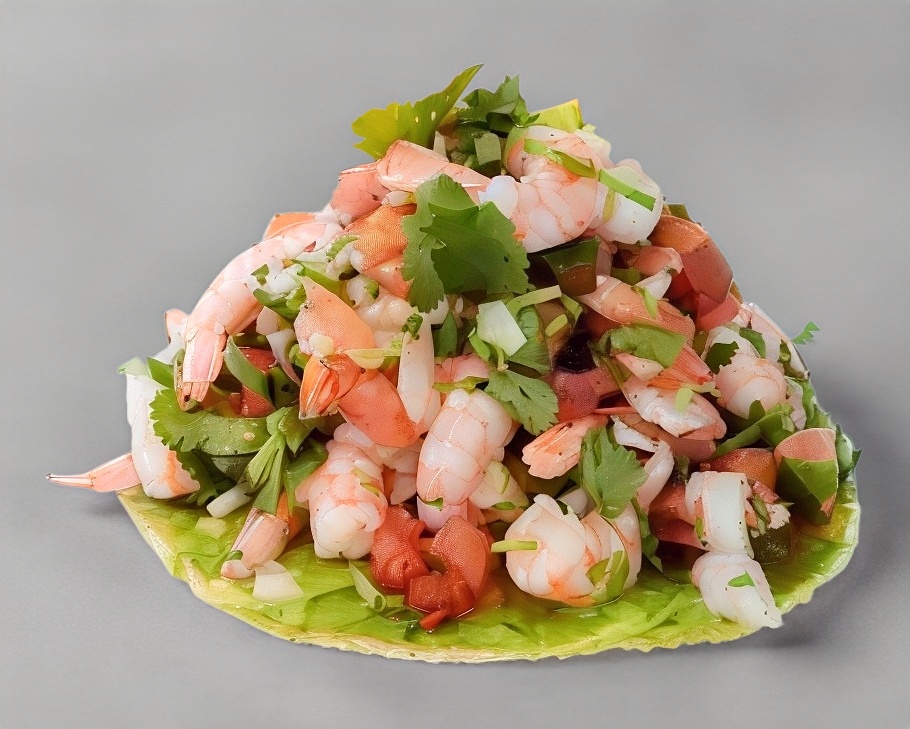 Deliciosa tostada de camarón 78gr, acompañada de guacamole embarrado, pico de gallo, pepino 4 rodajas, cebolla morada y tajín, para un total de 167gr aprox