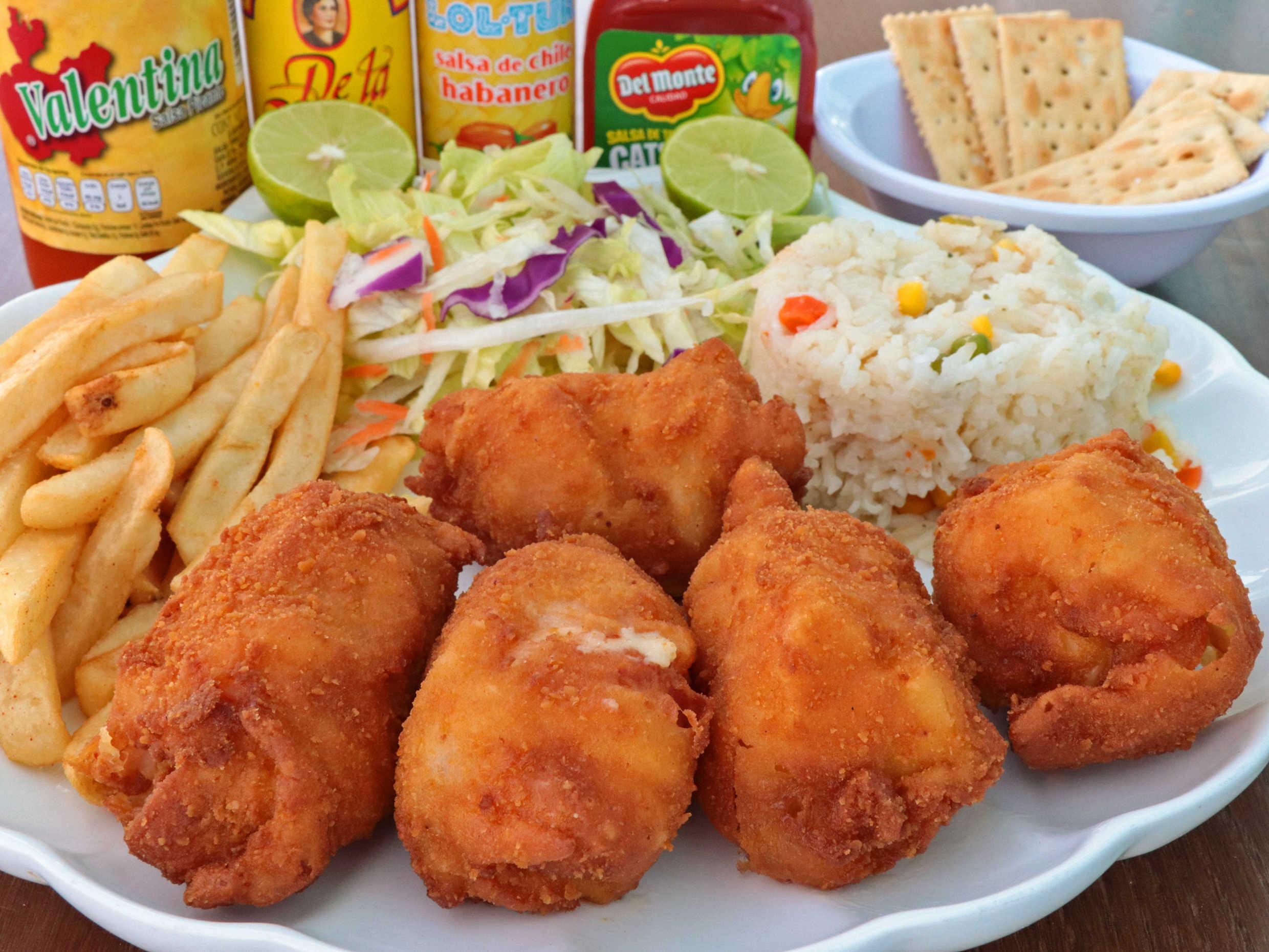 Empanizadas con el delicioso sabor nuestro de la casa, acompañadas de arroz y papas a la francesa.