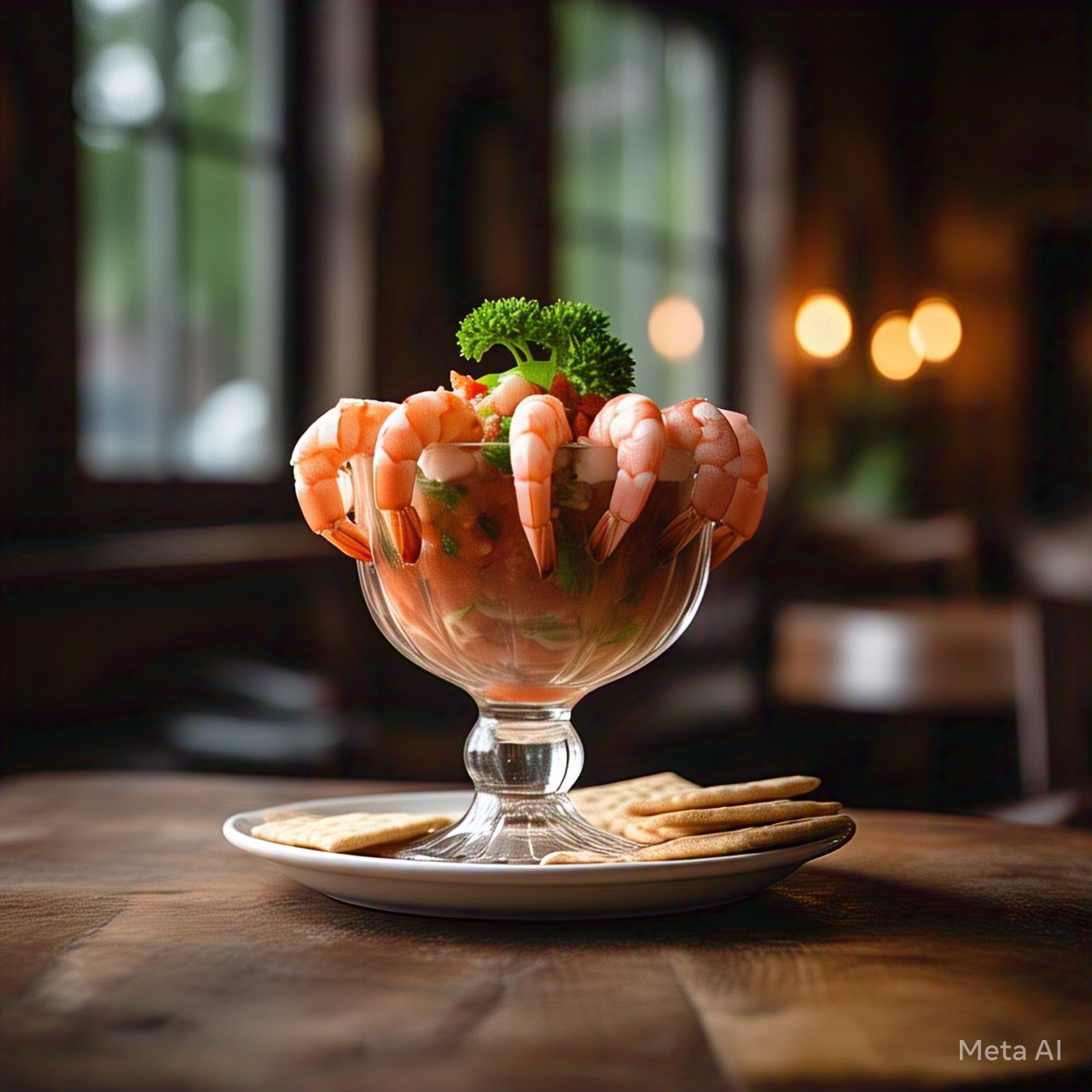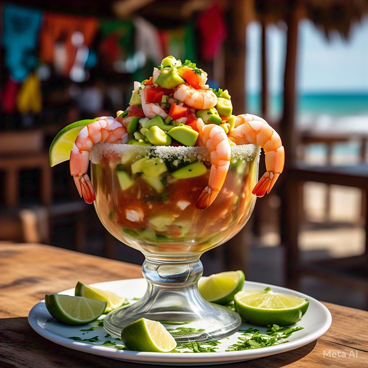Camarones cocidos ahogados en nuestra deliciosa mezcla para coctel, pico de gallo, aguacate, galletas saladas, totopos y salsa de la casa.