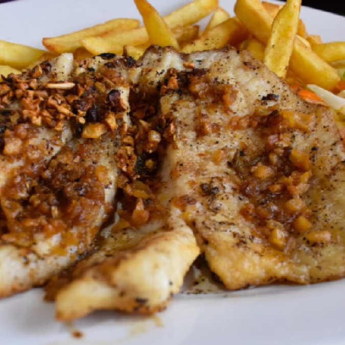 Filete bañado con ajo para darle ese sabor especial, acompañados de arroz, papas a la francesa, ensalada verde, salsa de la casa, totopos y limón.
