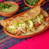 Tortilla de 30cm, cama de frijoles, carne guisada, salchicha, aguacate, lechuga,crema y tomate. ¡Llenas por que llenas!