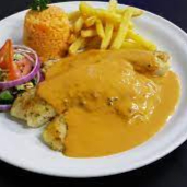 Para el bajón!!! Filete bañado en una salsa picosita sin comparación, acompañado de arroz, papas a la francesa, ensalada verde, salsa de la casa, totopos y limón.